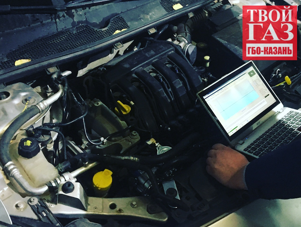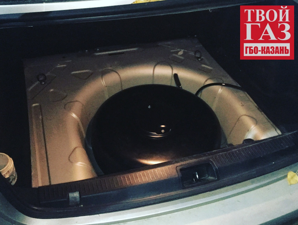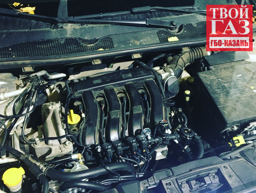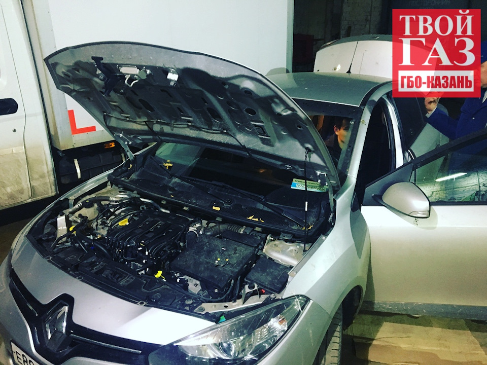 Установка газобаллонного оборудования на Renault Fluence, двигатель 4-цилиндровый, рядный, атмосферный, объем 1,6л (110 л.с.). Установлено ГБО 4-го поколения DIGITRONIC IQ 4, тороидальный баллон 47 л расположен на месте запасного колеса, заправочное устройство выведено под бампер.