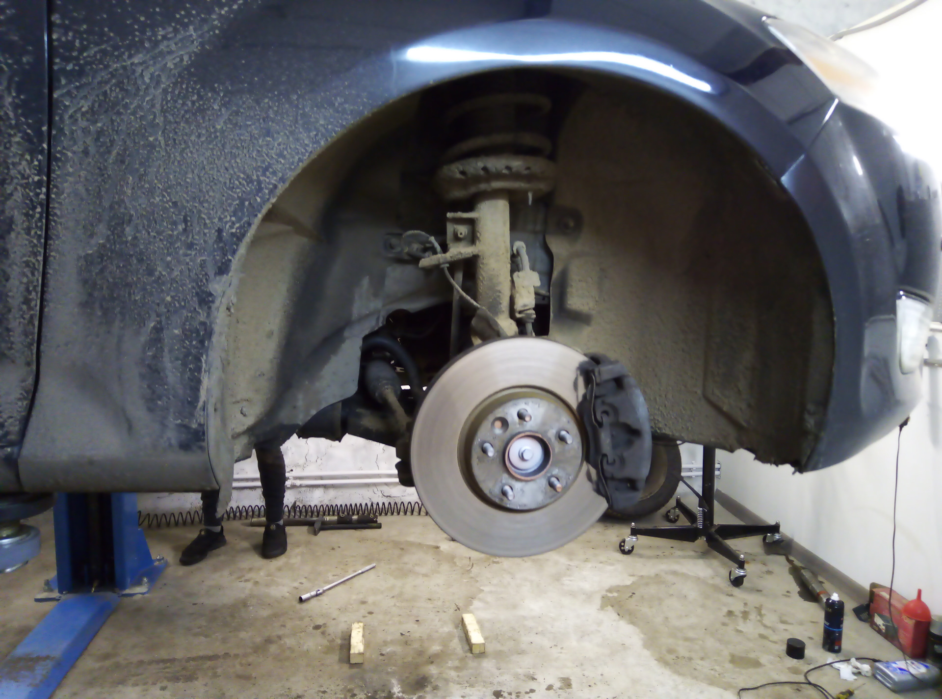 Приняв машину от клиента в ремонт, загнали в бокс и провели комплексную диагностику системы гур . Далее всё по стандарту : скинули колёса, зафиксировали руль, сняли рулевой кардан и приступили к съёму рейки . Для удобства приопустили подрамник .