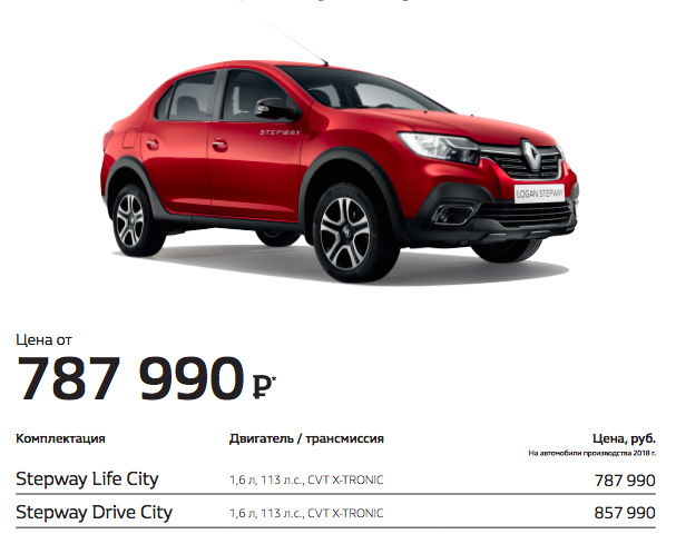 1. Новый "Renault SANDERO Stepway City" в хорошей комплектации "Drive City" 1,6 л, с вариатором стоит аж 896 990 рублей. Прибавьте те же "коврики, защиту двигателя", страховку (КАСКО) и вот уже стоимость Логана перешагивает "психологическую отметку" в 1 млн. рублей. Во первых, прийдется привыкать к новым ценам. Во вторых, наверняка найдутся люди, которые за эти деньги предпочтут купить что-то иное. Всё таки для многих потребителей — миллион это слишком высокая цена для "простого" (в их понимании) Логана.