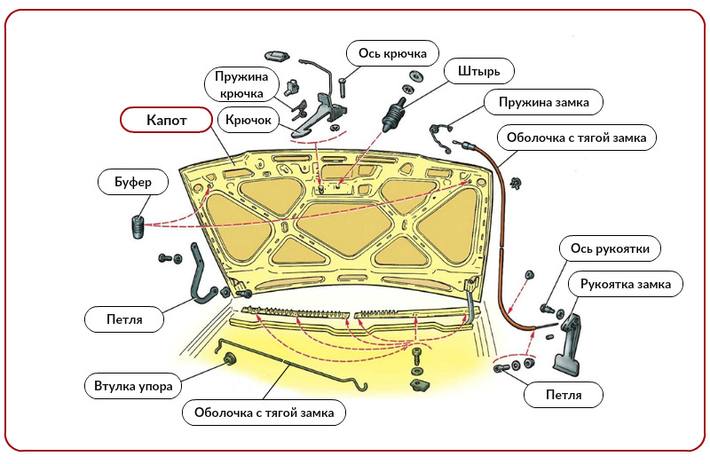 Вполне очевидной задачей замка капота является защита от несанкционированного доступа злоумышленников к подкапотному пространству. В нормальных условиях замок держит капот закрытым постоянно. Не важно, движется автомобиль или стоит на месте – капот не должен подпрыгивать, самопроизвольно открываться и прочее. Вмонтированный замок капота включает в себя следующие элементы: