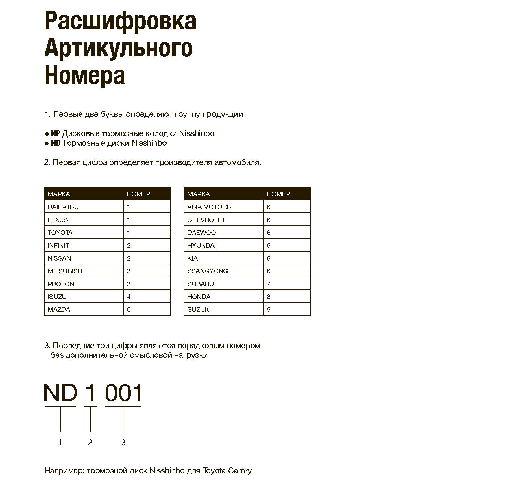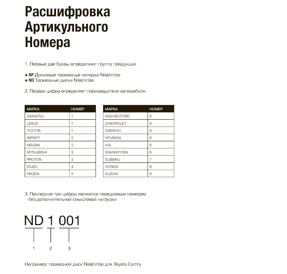 Что касается расшифровки новых обозначений. Первые буквы определяют группу продукции: NP – Nisshinbo Pads (колодки), ND – Nisshinbo Discs (тормозные диски). Далее идет числовой код, обозначающий марку автомобиля, а последние три цифры – это просто порядковый номер, для потребителя он не несет никакой полезной информации.