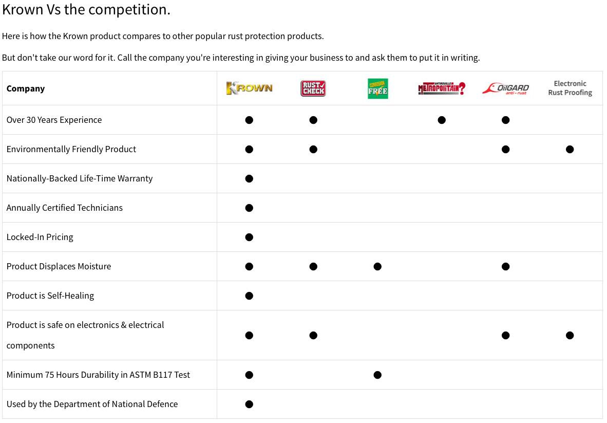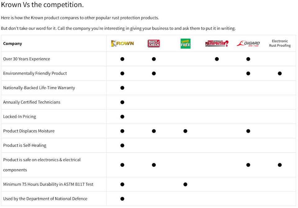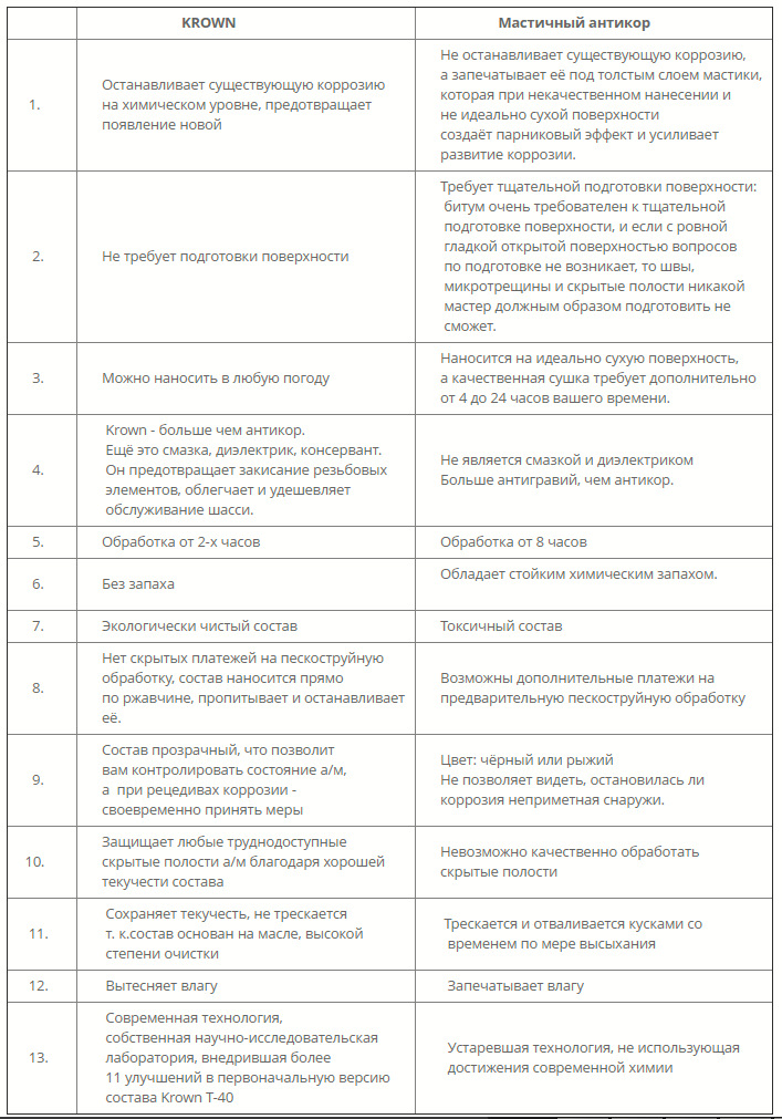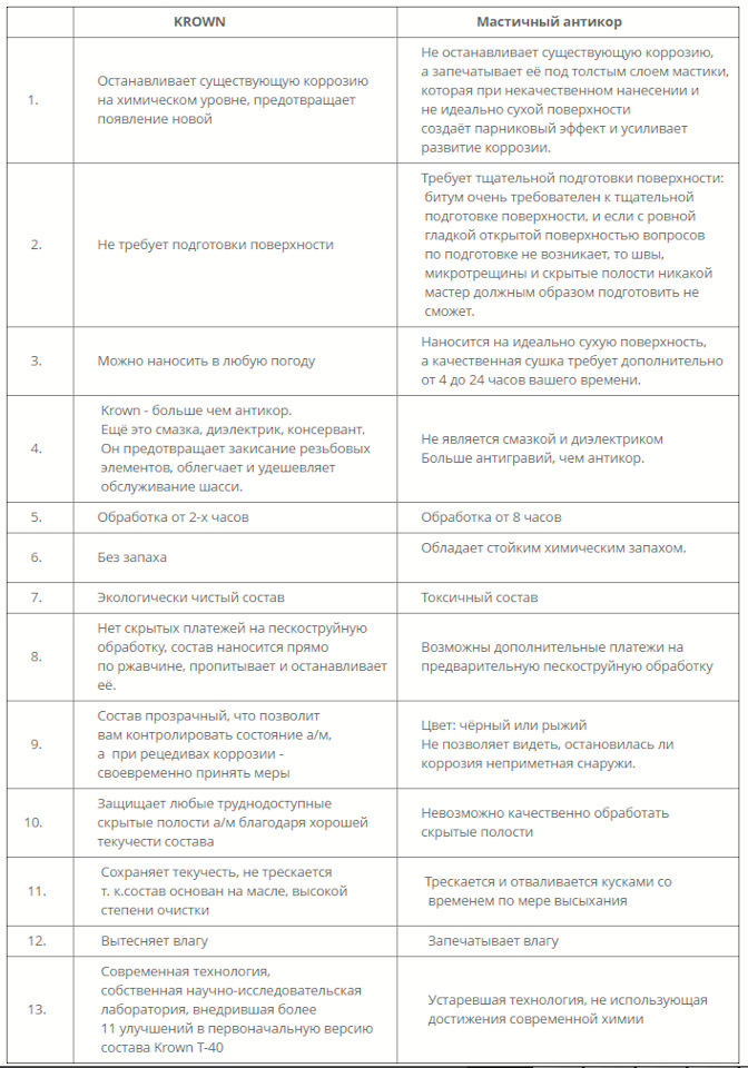Сравнение KROWN — антикора химического типа с антикорами мастично-битумного типа. Krown в отличие от них не трескается, не высыхает и не запечатывает влагу, а выталкивает её. Кроме того Krown — больше, чем антикор — 4 основных функции, антикор, консервант, диэлектрик, смазка. Он предотвращает закисание резьбовых элементов, облегчает и удешевляет обслуживание шасси.