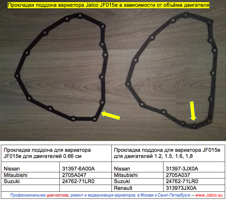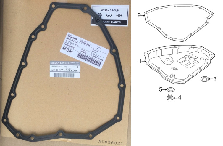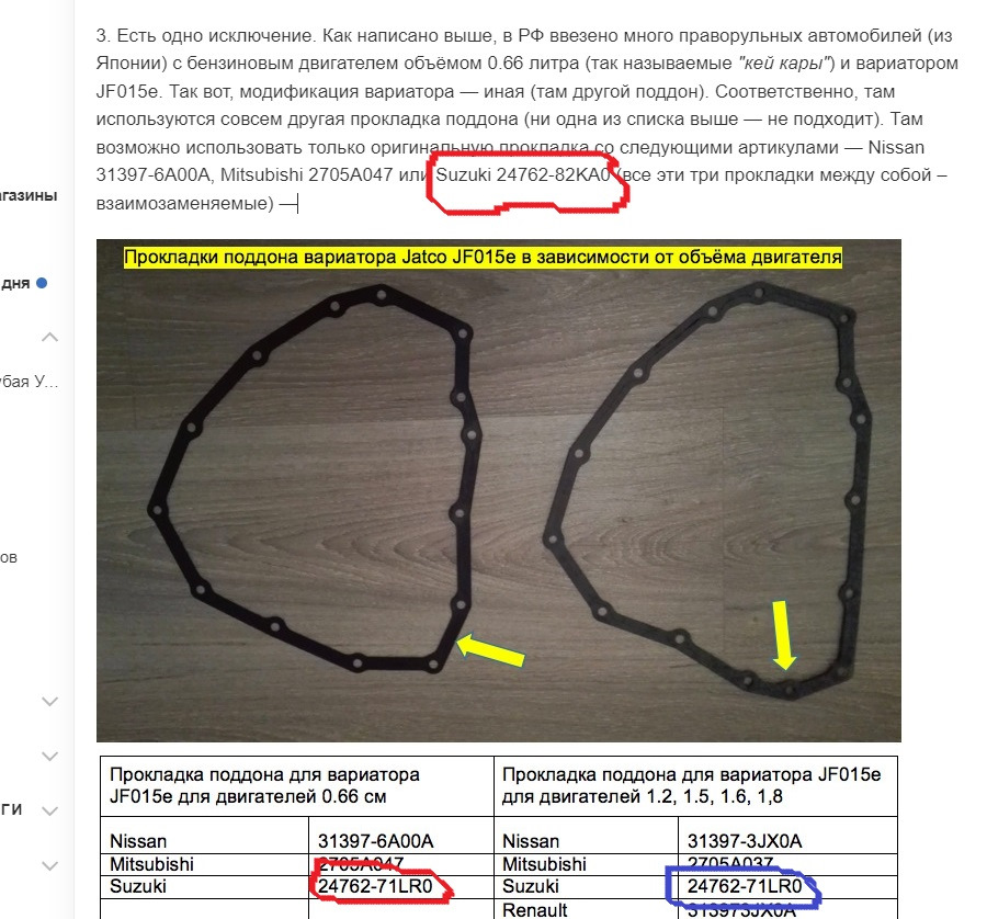 3. Есть одно исключение. Как написано выше, в РФ ввезено много праворульных автомобилей (из Японии) с бензиновым двигателем объёмом 0.66 литра (так называемые "кей кары") и вариатором JF015e. Так вот, модификация вариатора — иная (там другой поддон). Соответственно, там используются совсем другая прокладка поддона (ни одна из списка выше — не подходит). Там возможно использовать только оригинальную прокладка со следующими артикулами — Nissan 31397-6A00A, Mitsubishi 2705A047 или Suzuki 24762-82KA0 (все эти три прокладки между собой – взаимозаменяемые) —