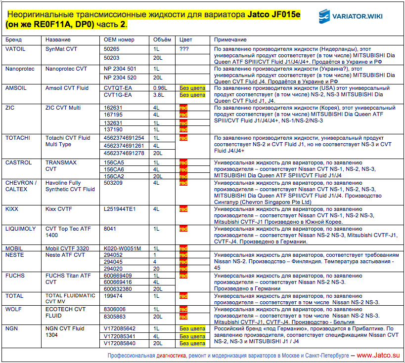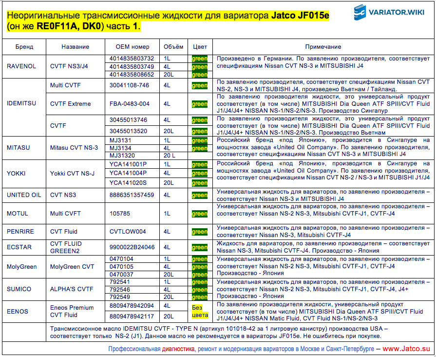 Есть так же большой выбор "неоригинальных" трансмиссионных жидкостей для вариатора Jatco JF015e самых разных производителей. Так же некоторые из них (не все) собрали в две(!) отдельные таблицы. Какую жидкость выбрать для своего вариатора (оригинальную или неоригинальную, а если не оригинальную, то какого производителя) — каждый принимает решение самостоятельно. Здесь нет какого-то одного единого рецепта (каждый человек имеет свой уровень доверия тому или иному бренду).