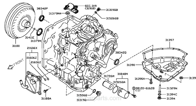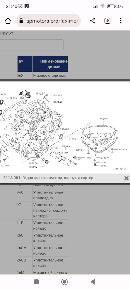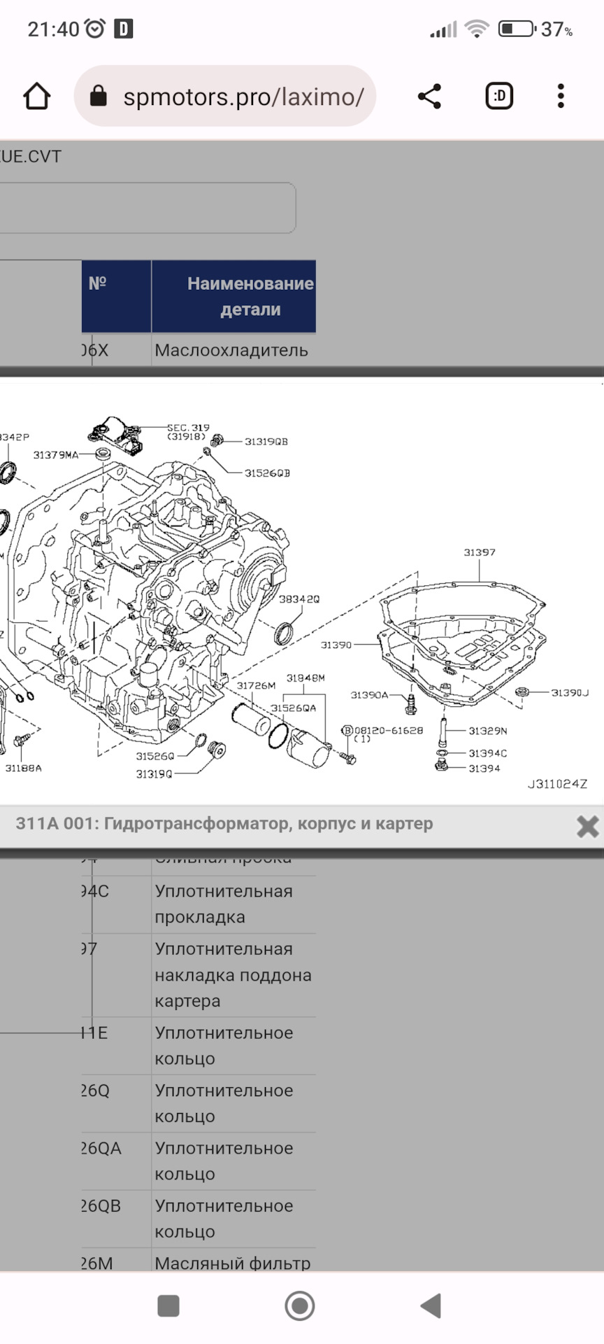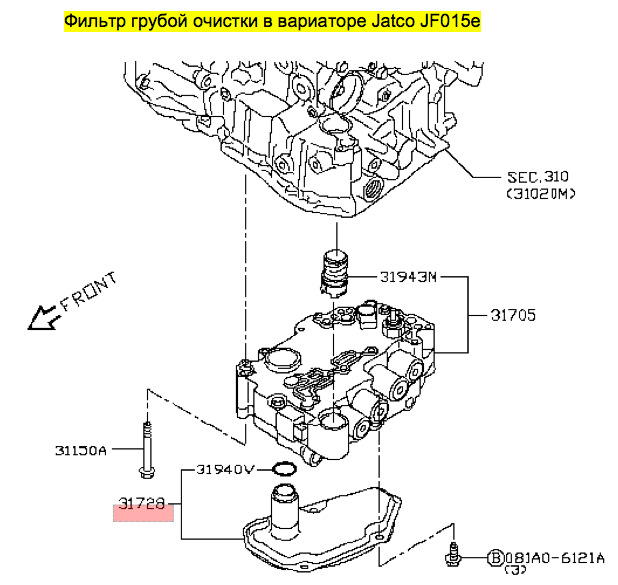 1. Обратите внимание, что компания Nissan имеет три(!) взаимозаменяемых каталожных номера на фильтр грубой очистки вариатора (на схеме выше он под номером 31728):