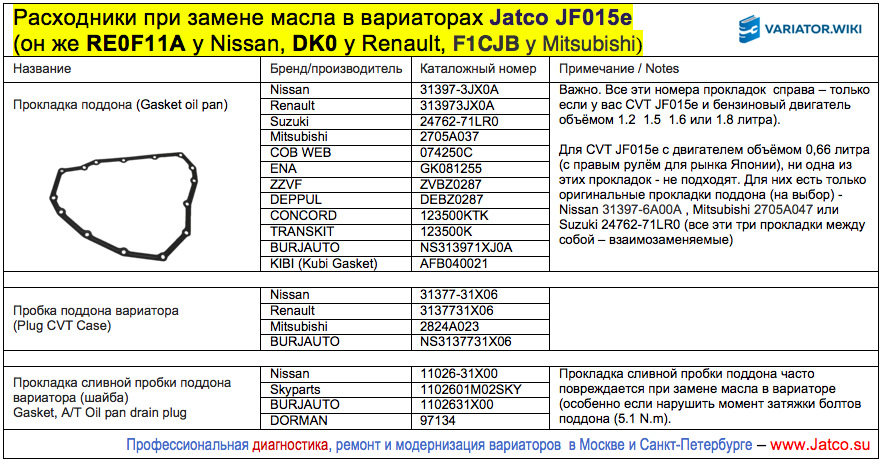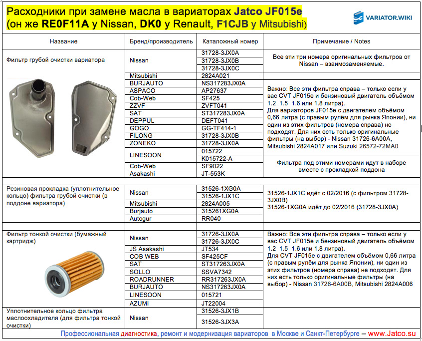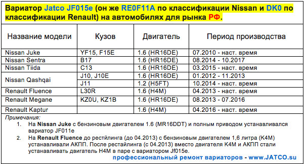 Для начала общая табличка распространенности вариатора JF015e (он же RE0F11A) в РФ. В России данная вариатор чаще всего встречается с бензиновым двигателем объёмом 1,6 литров на автомобилях "Nissan Juke, Qashqai, Sentra, Tiida" и Renault Fluence, Megane и Kaptur и Suzuki SX4. При этом у Ниссана данный вариатор имеет название RE0F11A, а у Рено он называется DK0.