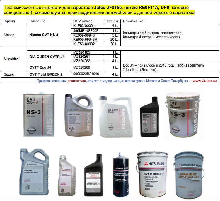 Трансмиссионные жидкости для вариатора Jatco JF015e которые официально(!) рекомендуются производителями автомобилей с данной моделью вариатора мы собрали в одну таблицу.
