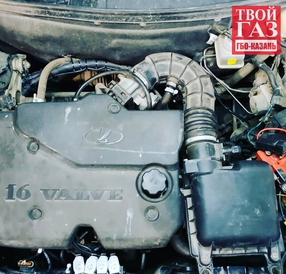 Установка газобаллонного оборудования на Ладу Приору, двигатель 4-цилиндровый, рядный, атмосферный, объем 1,6л (87 л.с.). Установлено ГБО 4-го поколения DIGITRONIC MAXI-2 тороидальный баллон 42 л расположен на месте запасного колеса, заправочное устройство выведено в багажник