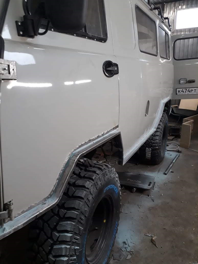 Гур на машине идет в комплекте, поэтому установили только рулевой демпфер РИФ. Кузов подняли над рамой на 65 мм, но резать арки, полы и двери пришлось капитально. Затем обваривать и делать отбортовку, к которой закрепили расширители арок из алюминия.