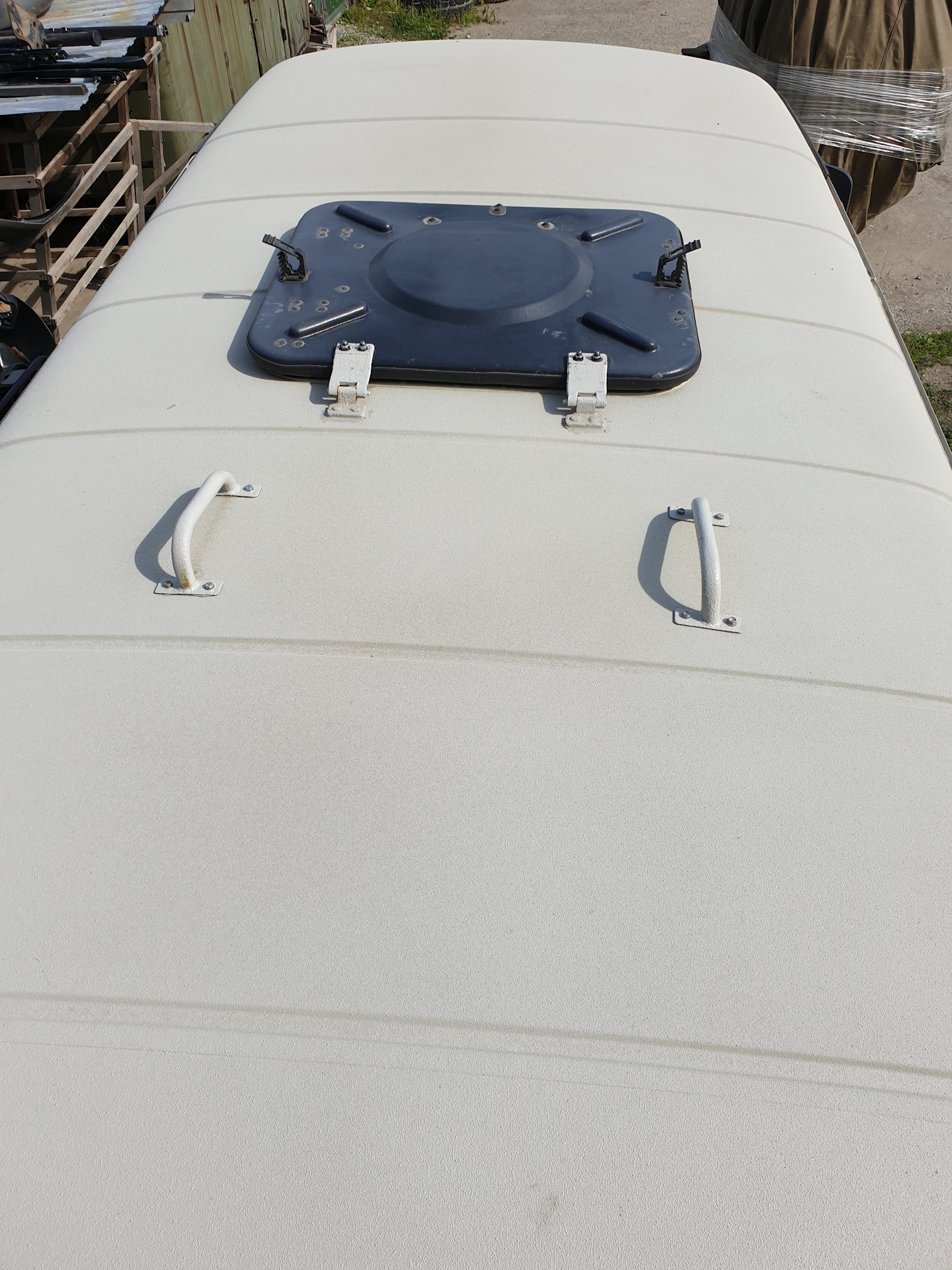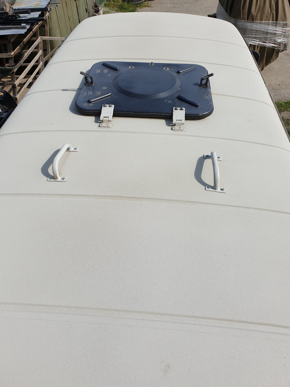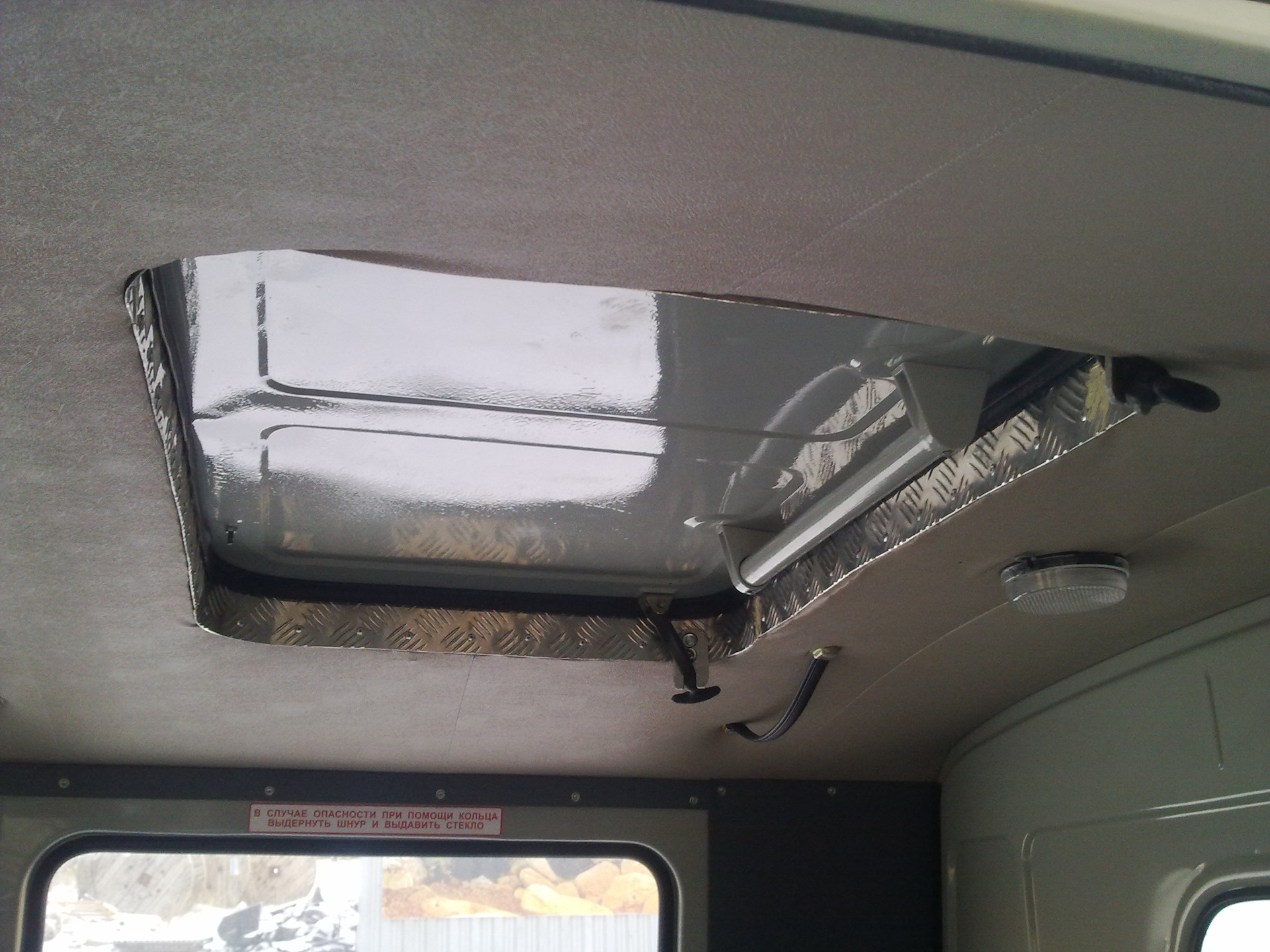 Окраска защитным покрытием RAPTOR — это не просто взял и облил машину, отлетит все через пару месяцев. Снять все окна, зашкурить до грунта кузов, окрасить кислотным грунтом, а затем покрыть защитной Raptor в 3 слоя и потом все собрать уходит пару рабочих недель. Расход Raptora на буханку примерно 16 литров. Силовой обвес РИФ перекрашивать не стали, т.к заводская порошковая покраска служит долго, а лучшее враг хорошего. Из полезностей установили большой охотничий люк. Подошел от автобуса, но чтобы откидывался назад установили его на дверные петли. А, чтобы не брякал и не закрылся случайно на голову, закрепили его в открытом положении универсальными креплениями Самохват, за ручку.