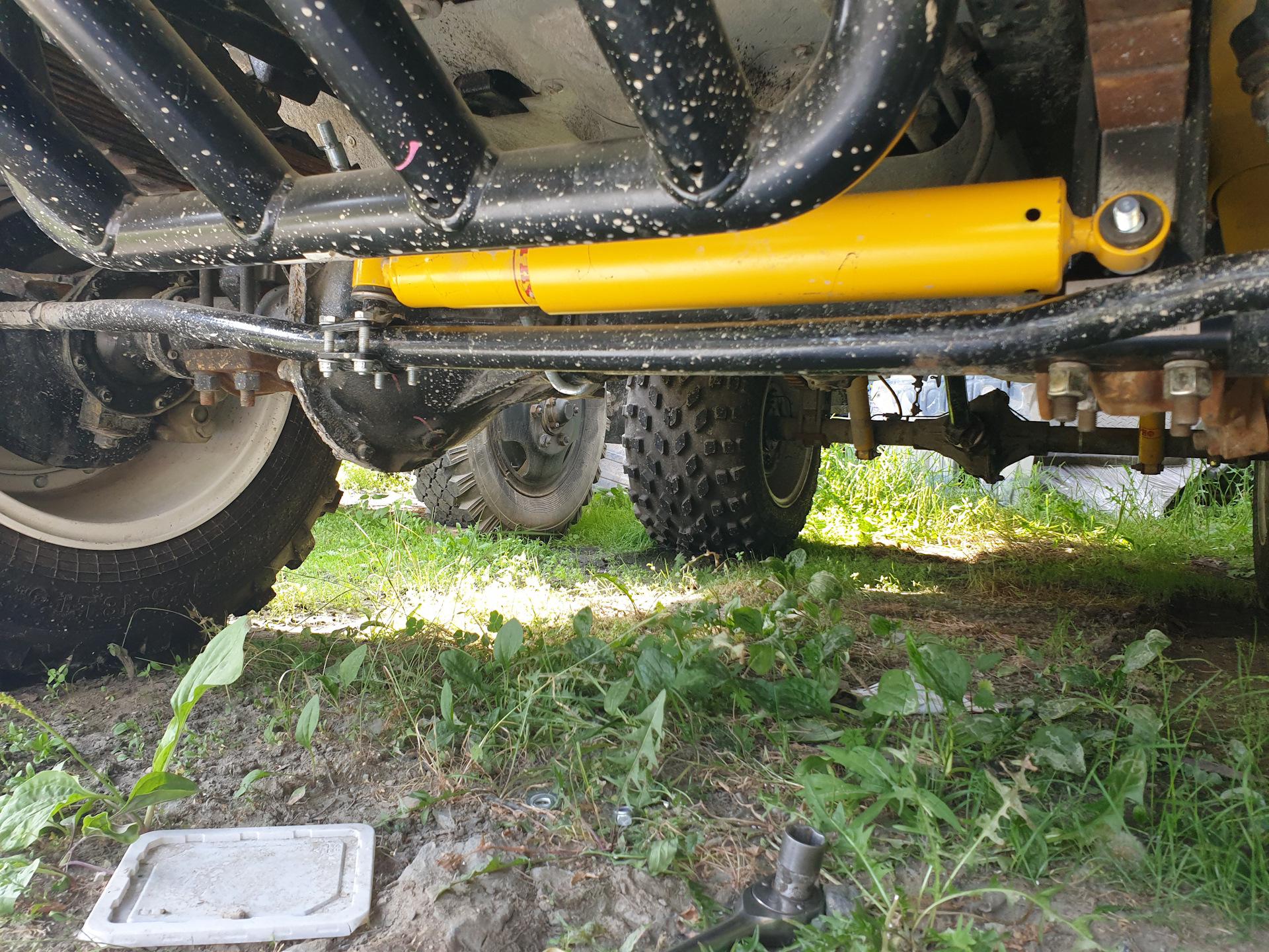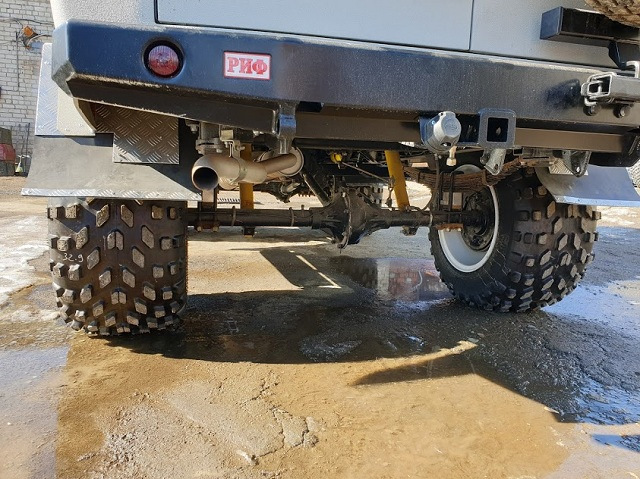 Постройку начали, как обычно, с фундамента. Проставки под рессоры 40 мм, усиленные амортизаторы РИФ +40 мм, проставки под передний и задний кардан по 10 мм и 20 мм соответственно. Для повышения тяговых характеристик в трансмиссии установили главные пары 5.13 и самоблокируемые дифференциалы. В раздатке заменили пониженный ряд на 2.5 от ИжТехно.