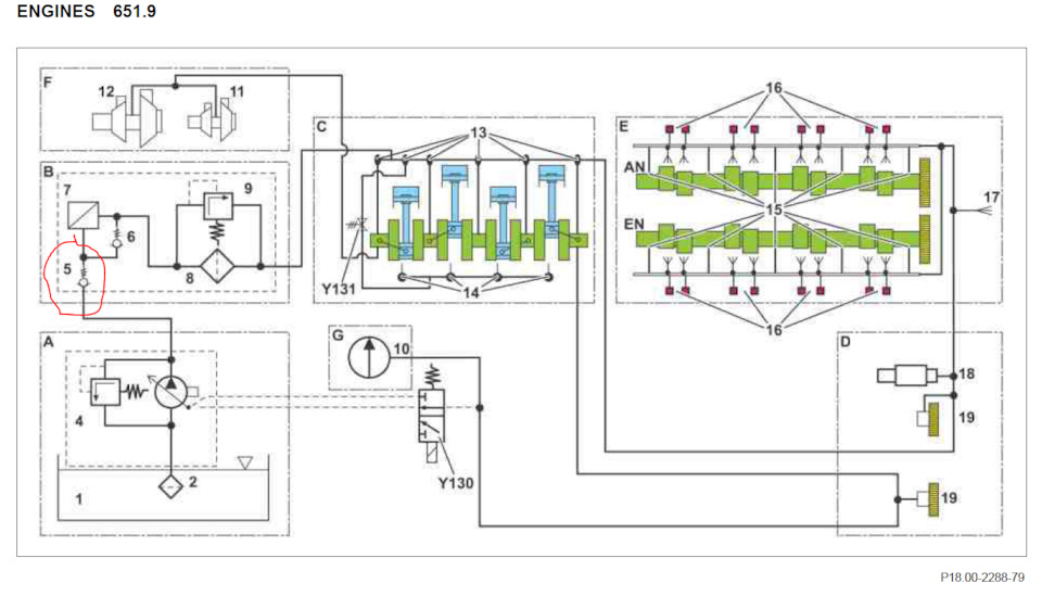 Схема из wis, есть схемы на 651 с ним и без него. У меня проблема ухода масла из корпуса масляного фильтра при стоянке и как следствие отсутствие давления масла 5-7 секундомер запуска двигателя.