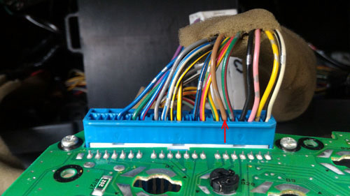 Подключение функции автоматического включения "аварийки" при движении задним ходом реализуется за счет подпаивания провода Rear к проводу в синей колодке панели приборов: КОНТАКТ №46 — 6 контакт справа на синем разъеме, коричневый провод с серебряной полосой, на фото отмечен красной стрелкой: