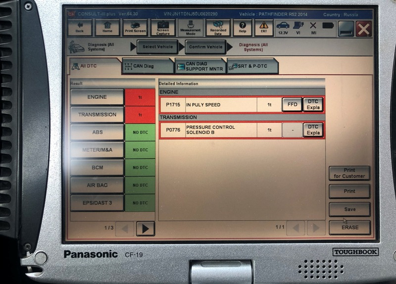 В случае выхода из строя вариатора JF017E существуют разработанные способы ремонта и восстановления. Начинается все с опроса систем трансмиссии сканером Nissan Consult 3 plus с целью выявления начальных ошибок и параметров работы Вариатора.