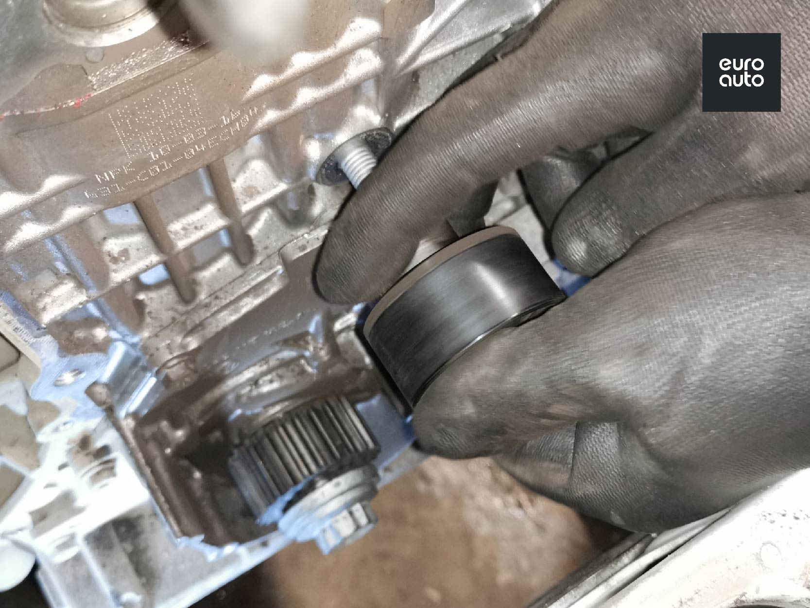 — натянуть ремень, провернув ролик по часовой стрелке, за натяжение отвечает пружина внутри ролика;