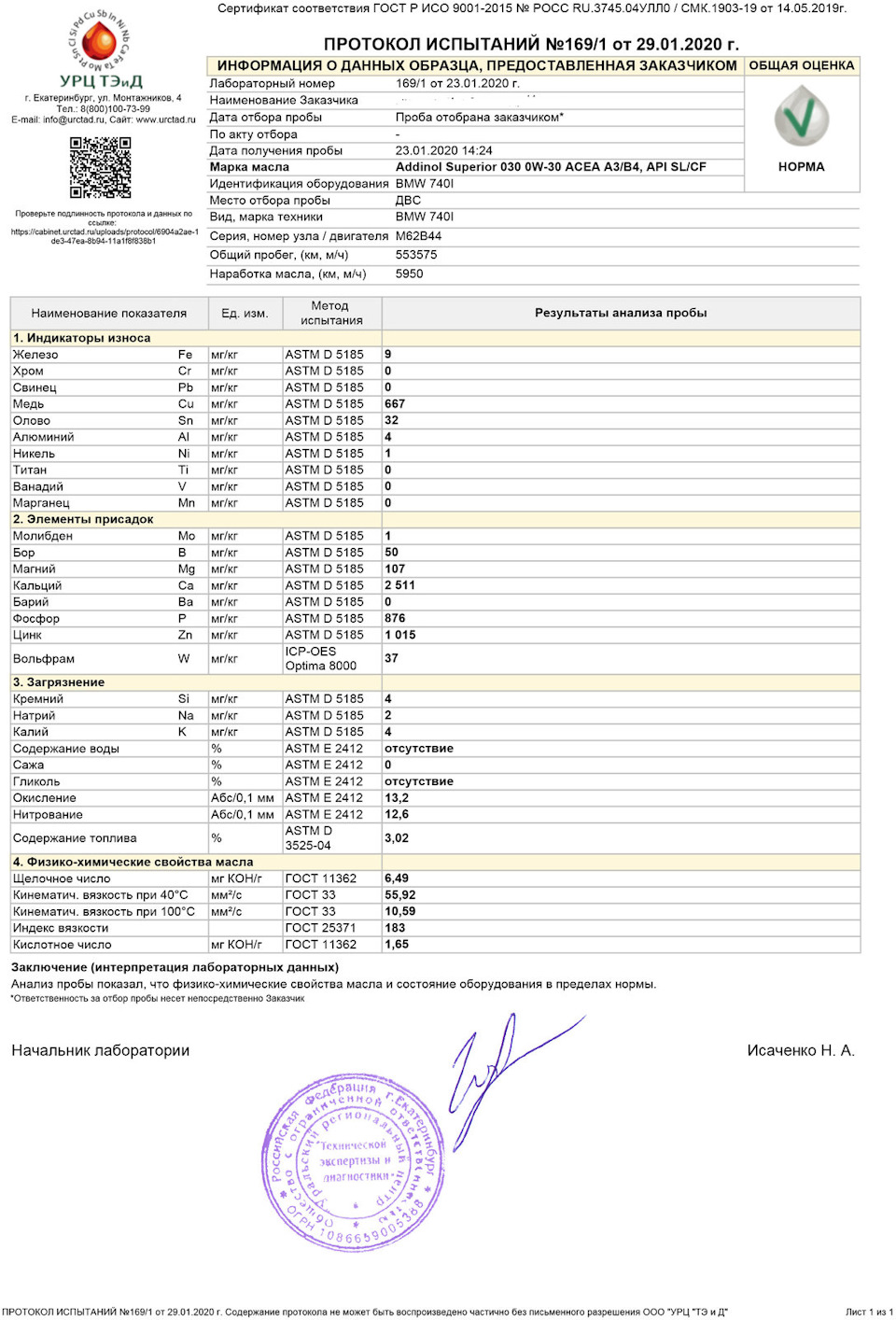 Результаты анализа показали что масло еще можно эксплуатировать дальше и не мало. Вязкость в норме, TBN высокий, TAN низкий и в целом все параметры очень хорошие.
