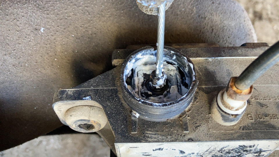 Если не заклинил левый трос, отсоедините сначала правый трос, потом потяните левый, чтобы фиксирующая четырехгранная гайка вышла из корпуса и выкрутите левый трос из тяги привода. Если заклинил. Разобрать блок, расклинить привод и трос (если заклинивший). Затем выкрутить трос.