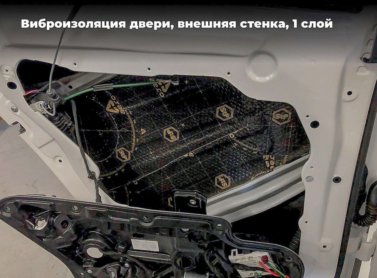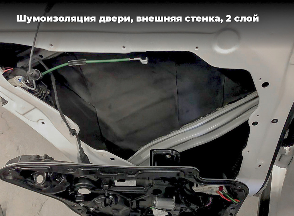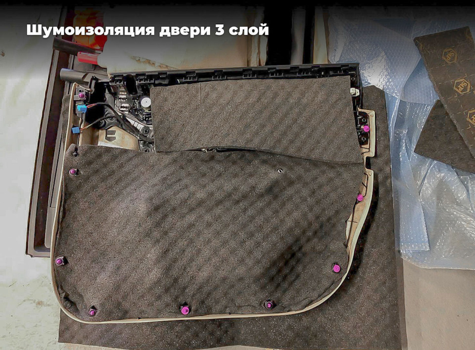 3. Двери делаем в 4 слоя. На внешнюю стенку наносим вибродемпфер STP AERO (2 мм) и звукозащиту Armaflex ACE-06-99/EA (6 мм). Внутреннюю стенку покрывают тем же STP AERO (2 мм) и Biplast Premium 15A (15 мм) в качестве четвертого слоя шумоизоляции автомобиля Mercedes GLC.