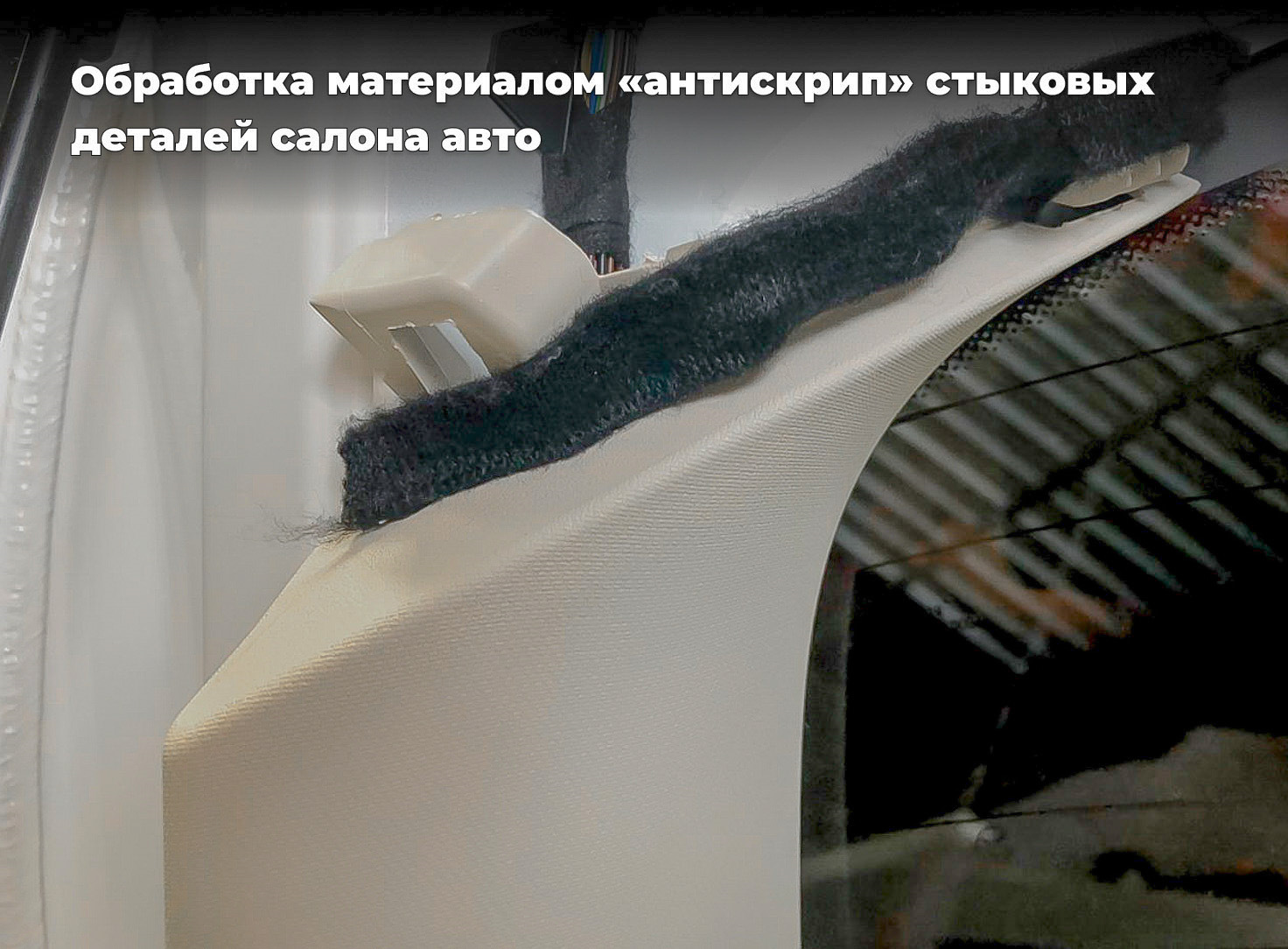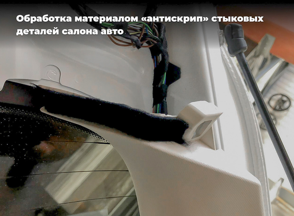 Все пластиковые стыковые детали мы проклеиваем противоскрипным материалом, который в свое мере снижает уровень неприятных скрипов во время вождения.