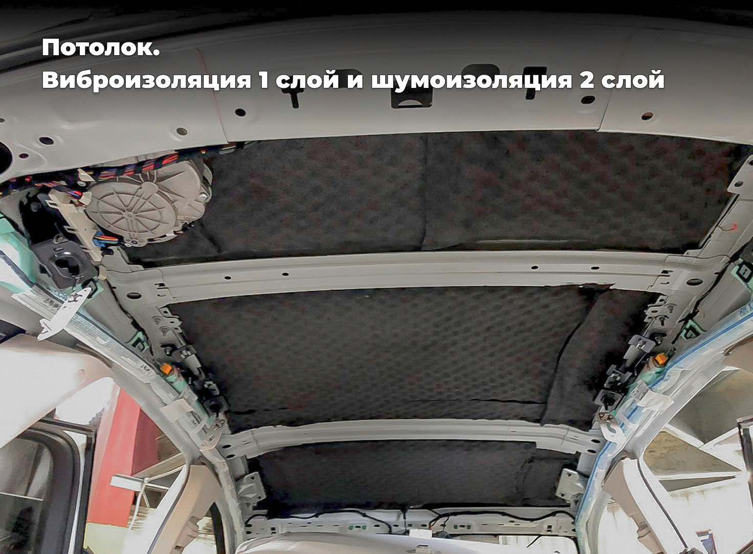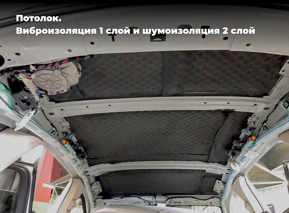 2. Шумоизоляция крыши. Для поглощения вибраций, возникающих на потолке, применяем покрытие STP AERO (2 мм). За звукоизоляцию этого участка кузова будет отвечать Biplast Premium 15A (15 мм) – вспененный вязко-эластичный полиуретан.