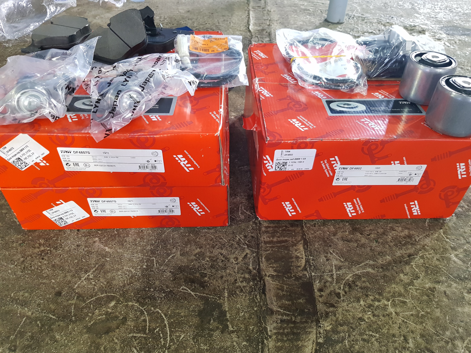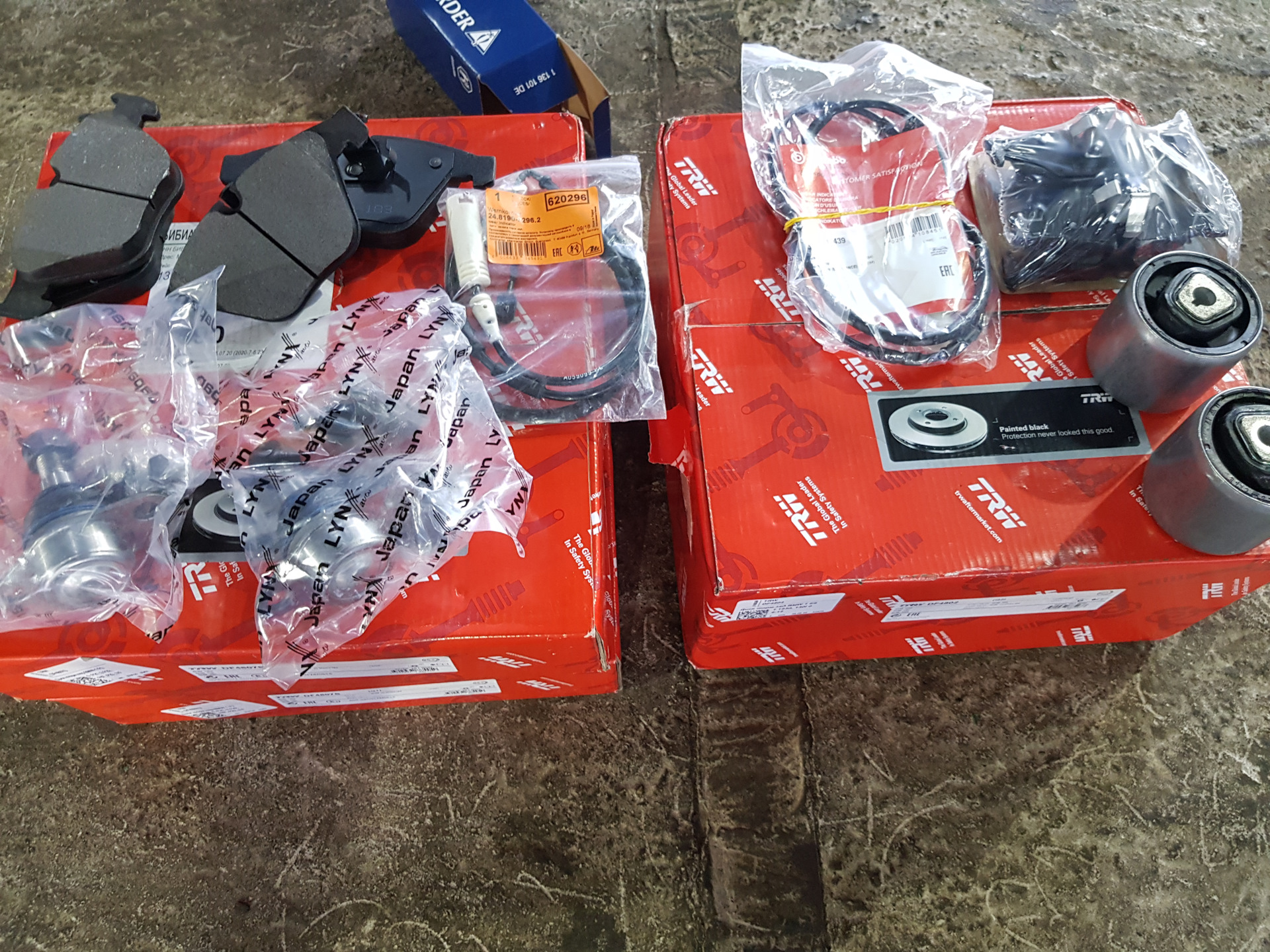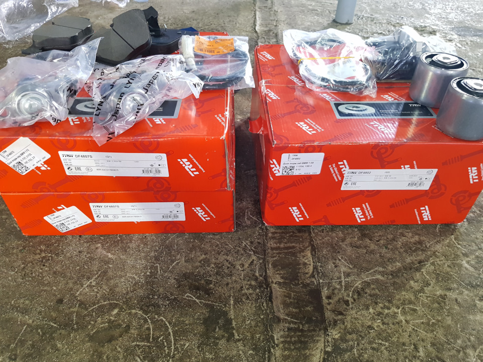 Тормозные диски и колодки по кругу с датчиками износа.