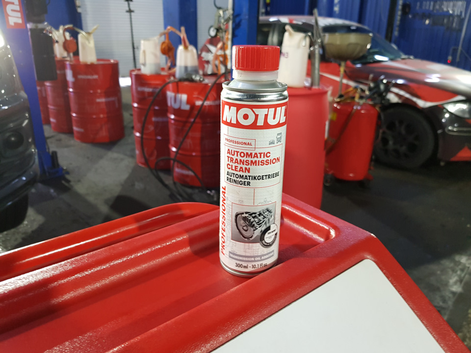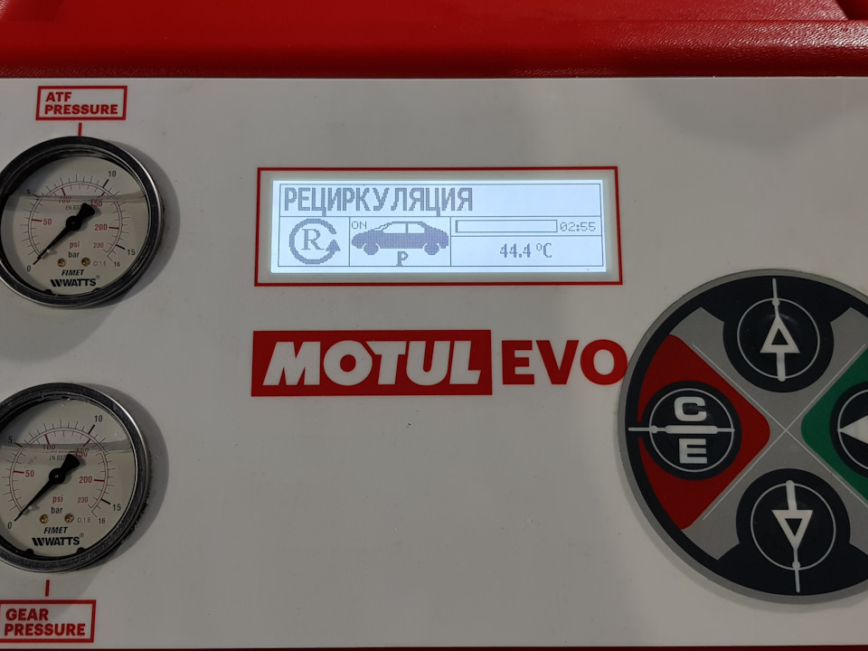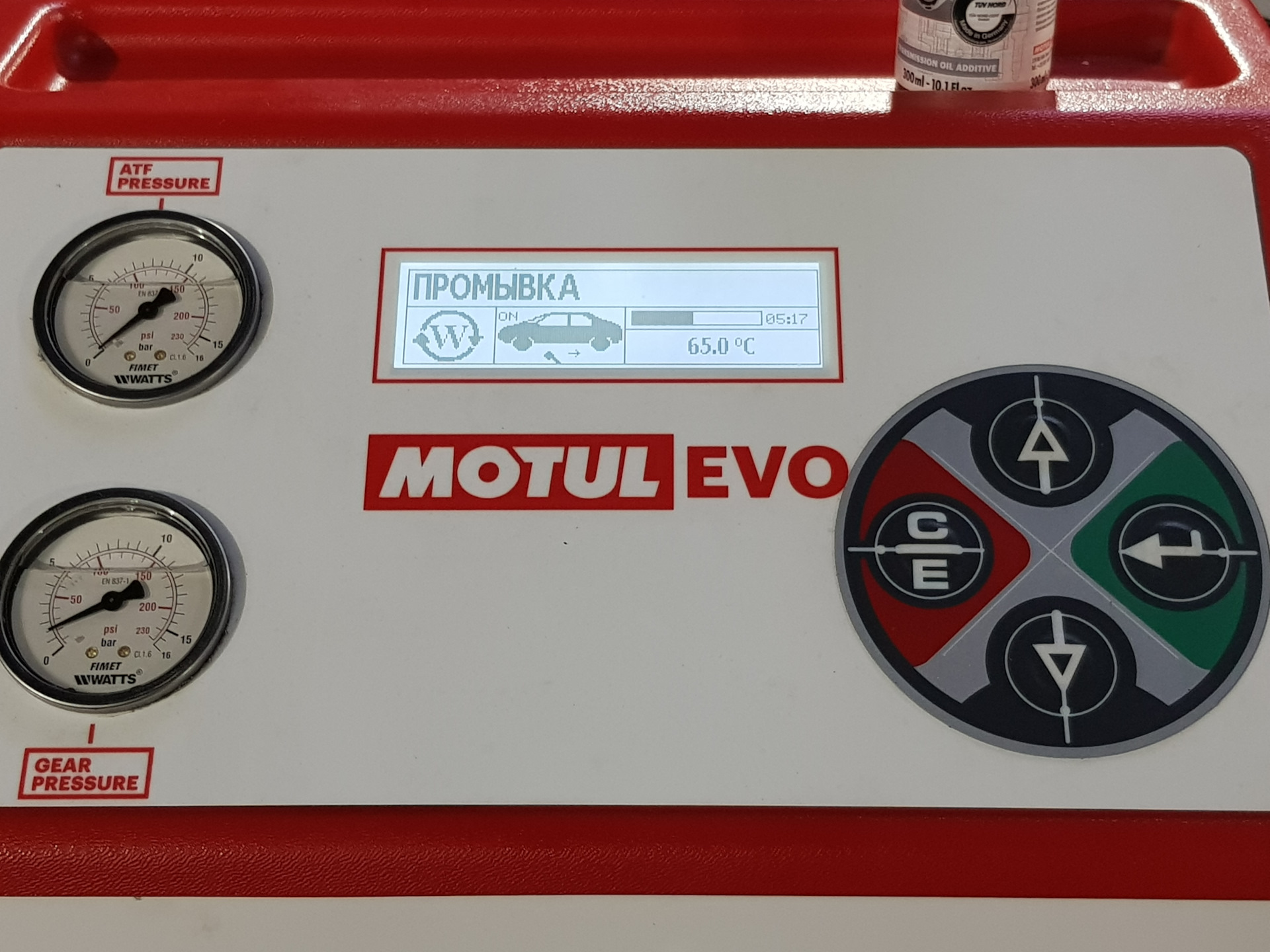 Подключаемся к контурам охлаждения, добавляем промывочную присадку (Очиститель автоматической трансмиссии motuL (0,3л) Motul 108127), включаем режим промывки. Затем переключаем передачи с интервалом 10-15 секунд в режиме промывки на 10мин. Промываем каналы и клапаны.