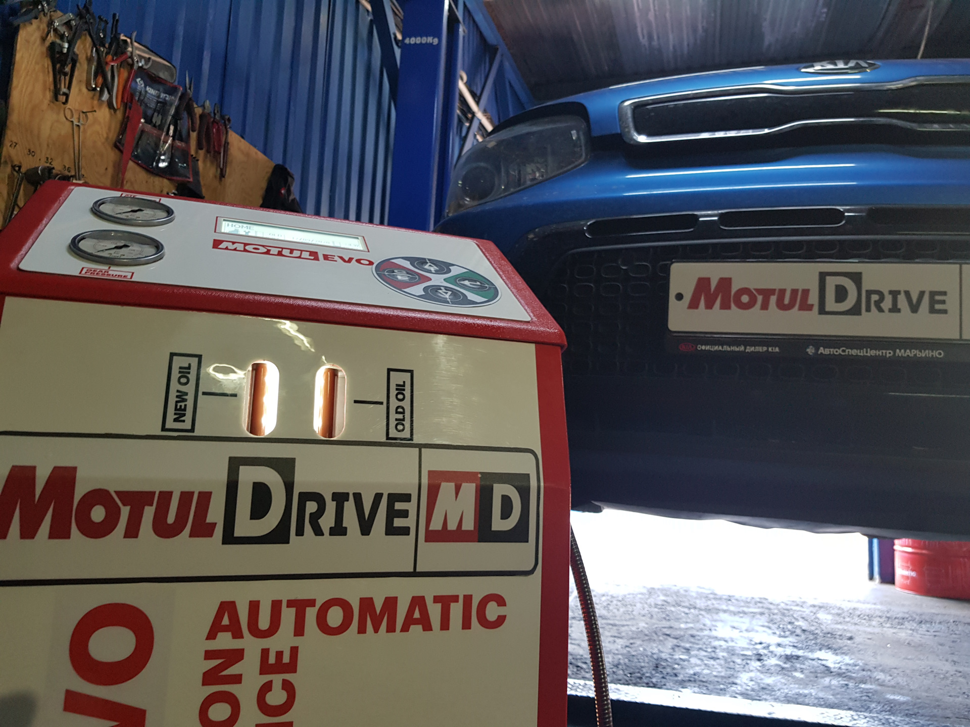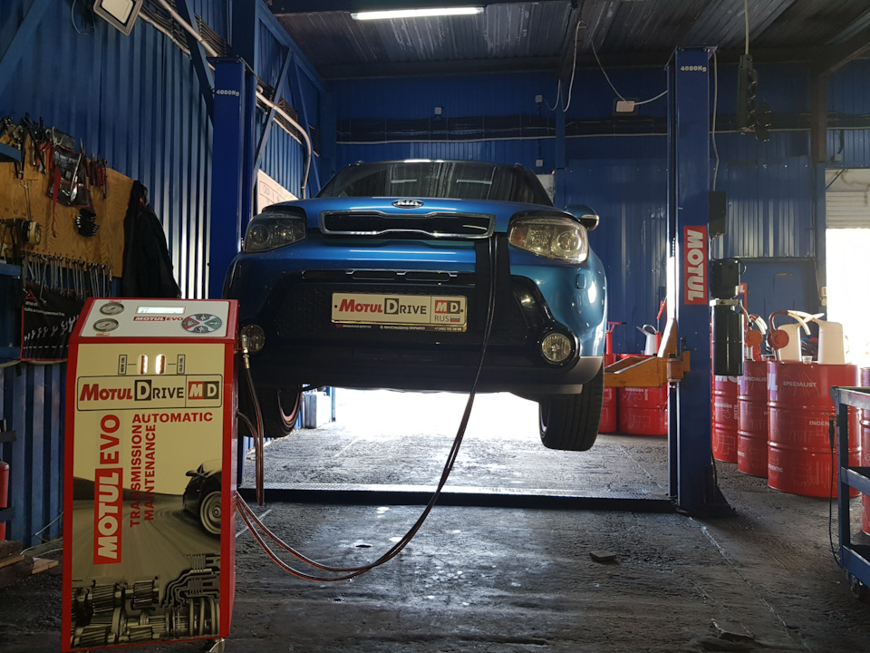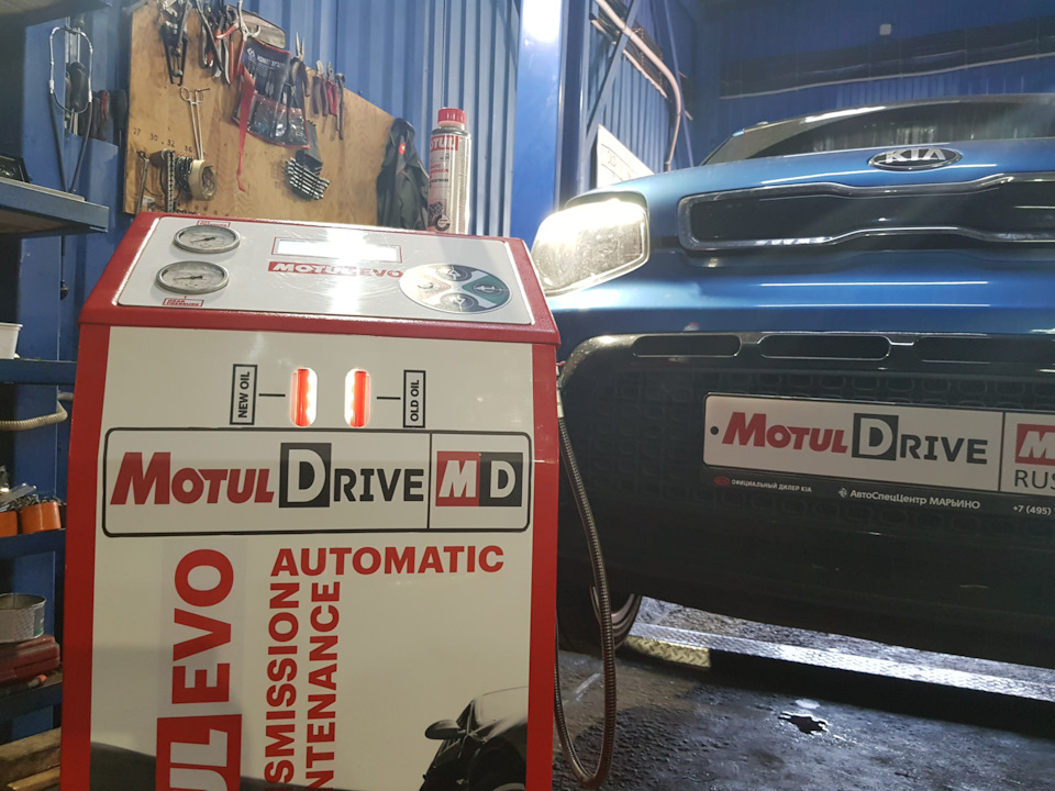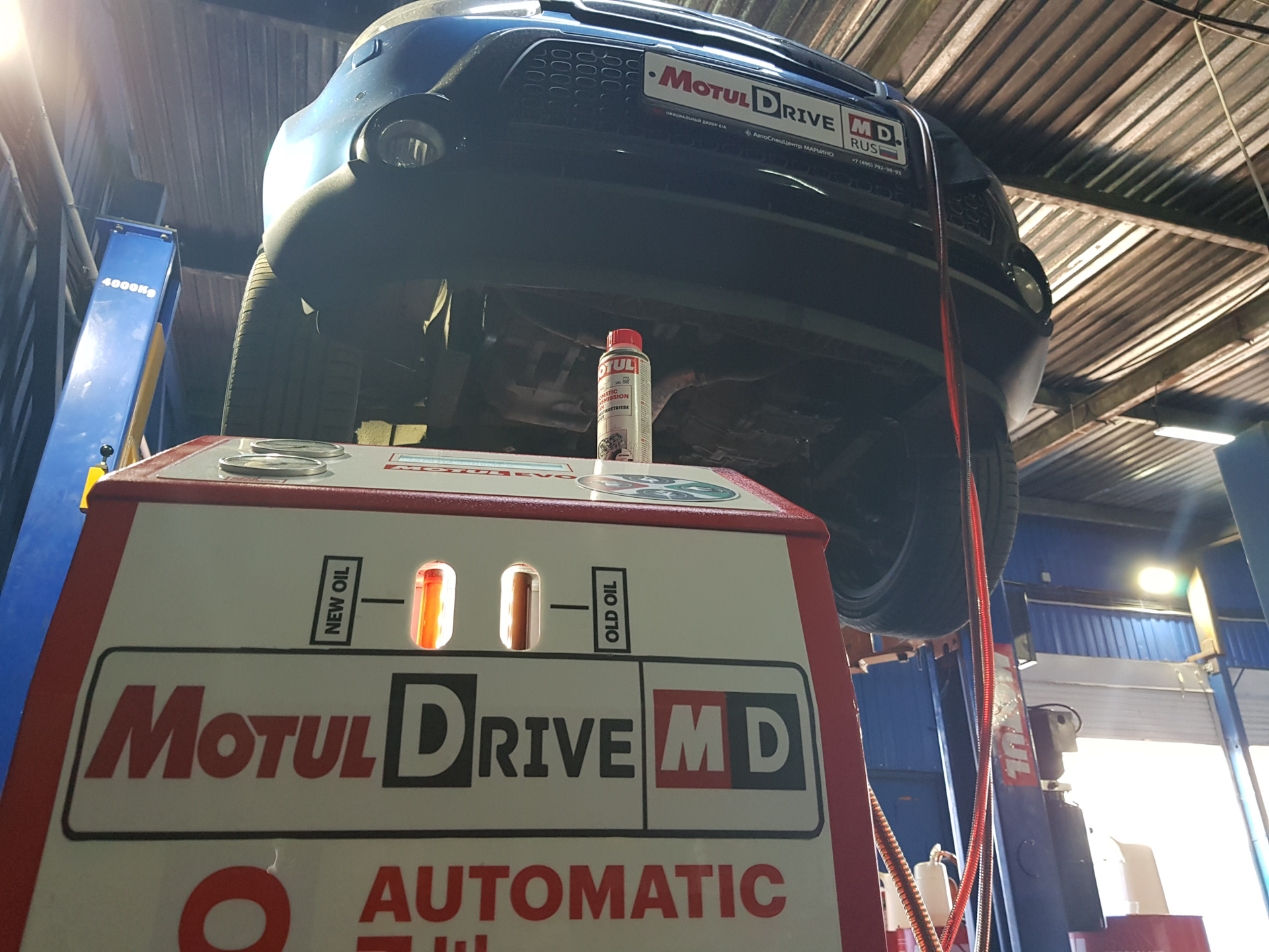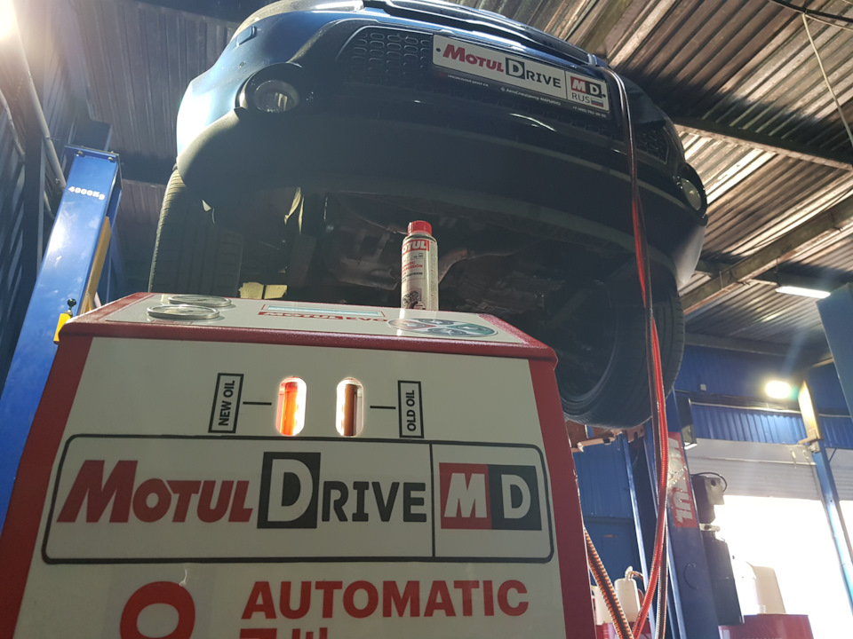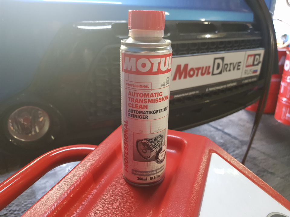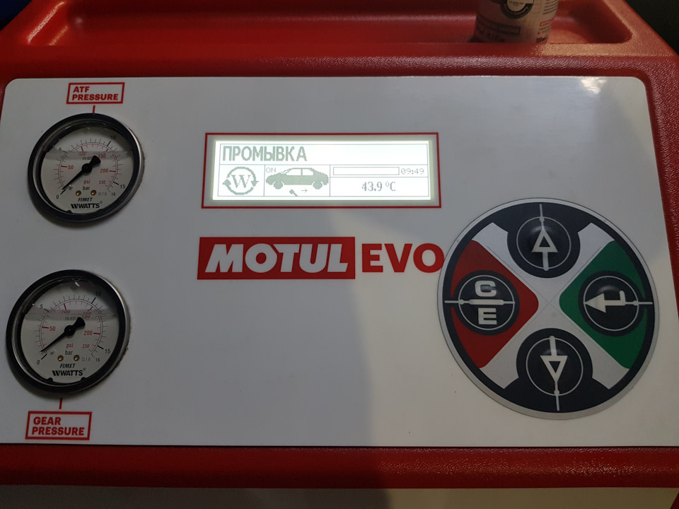 Подключаемся к контурам охлаждения, добавляем промывочную присадку (Очиститель автоматической трансмиссии motuL (0,3л) Motul 108127), включаем режим промывки. Затем переключаем передачи с интервалом 10-15 секунд в режиме промывки на 10мин. Промываем каналы и клапаны.