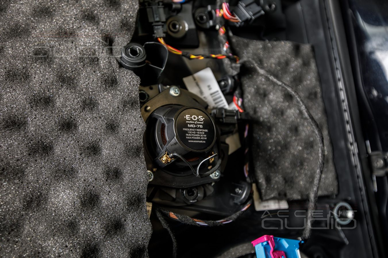 — Среднечастотники E.O.S MD-75. Тут всё же есть некоторый компромисс. Читающие сайт Accent-Audio знают, что в такой комплект мы бы неизбежно предложили бы лучшие серединки Brax ML3, но в конфигурации “пока останемся в штатных местах” им, конечно же, не место. Слишком хороши и слишком дороги ML3, чтобы задавить их прелести заводской дверной сеткой и расположением “в колено”. Поэтому заказчику был предложен такой вариант: сейчас ставим недорогие, но замечательные E.O.S MD-75, но если вы вернетесь за дальнейшим развратом, то в стойки мы уже будем интегрировать Brax ML3, стоимость же E.O.S зачтем в некоторые работы. Так будет честно и по отношению к звуку и по отношению к деньгам клиента.