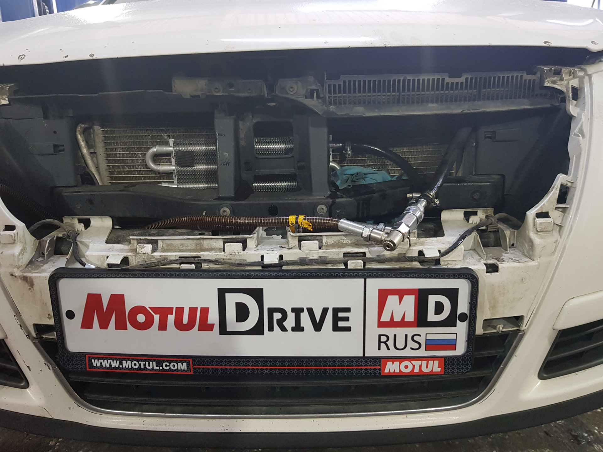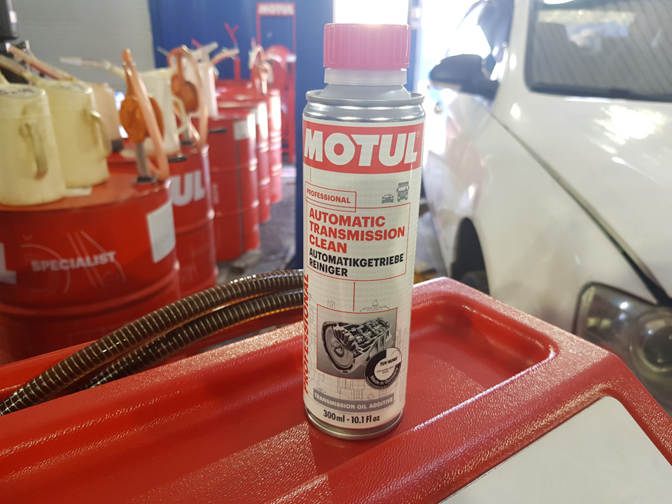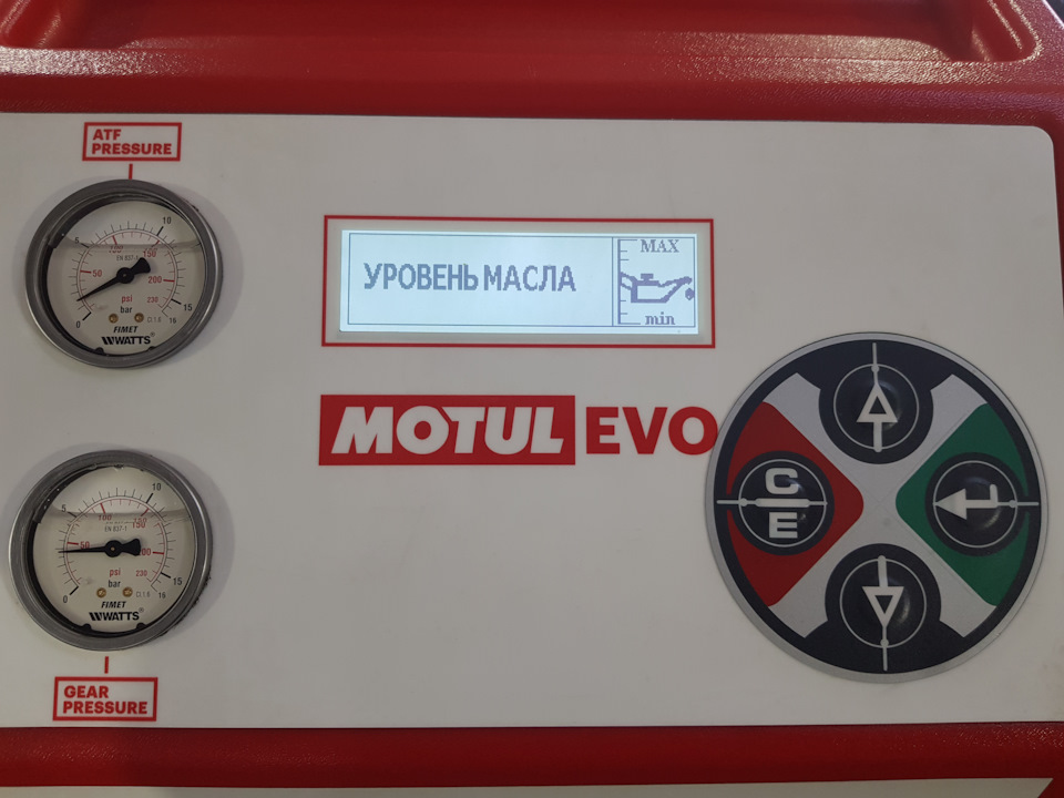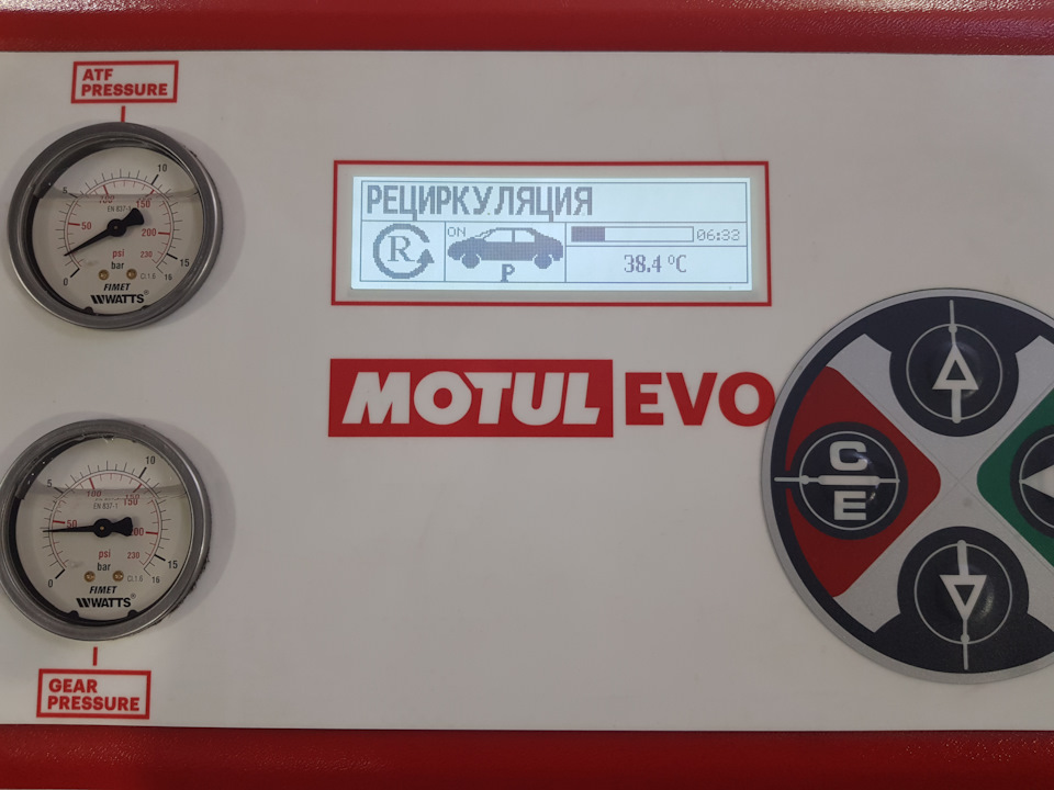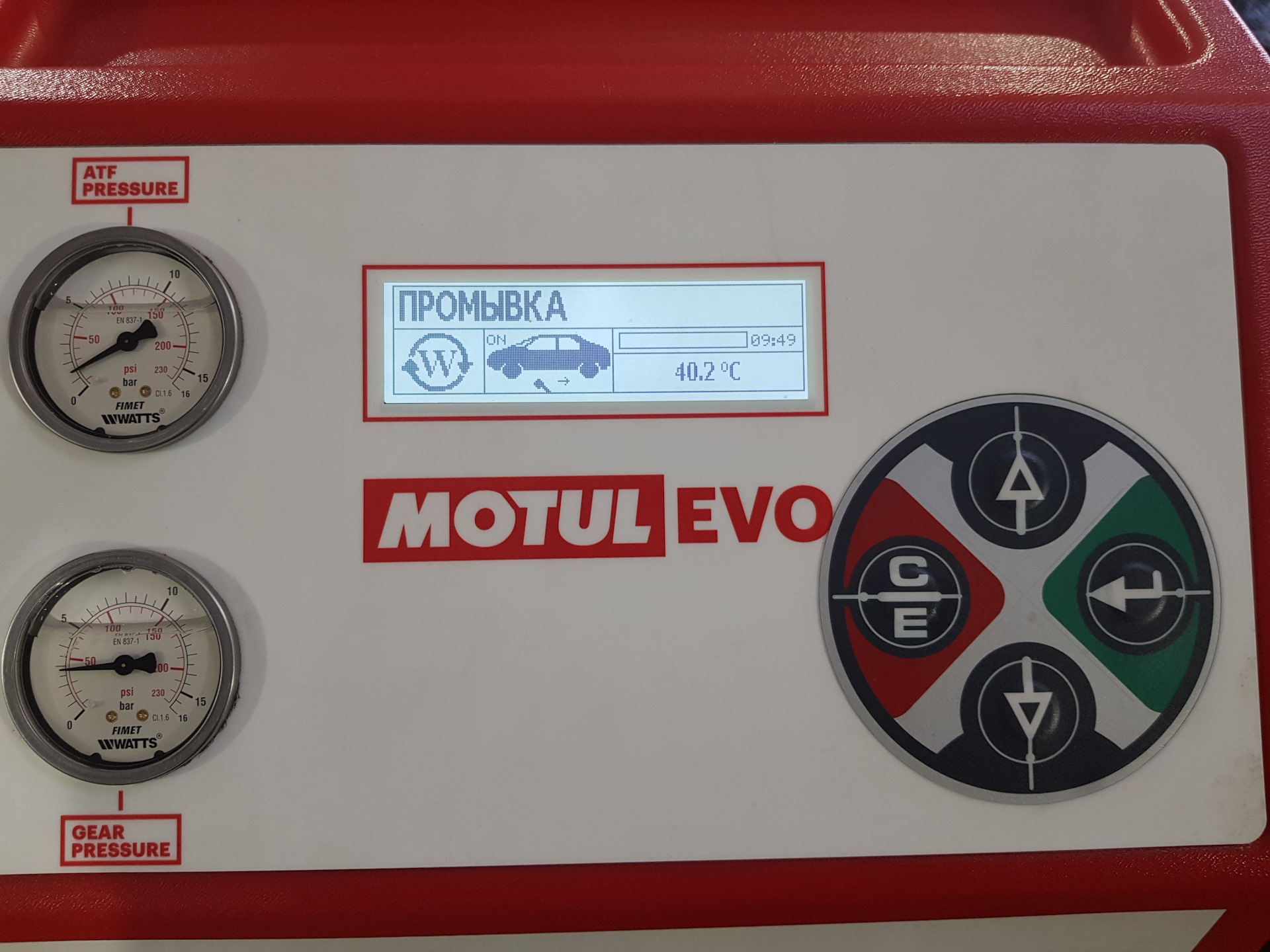Подключаемся к контурам охлаждения, добавляем промывочную присадку (Очиститель автоматической трансмиссии (0,3л) Motul 108127), включаем режим промывки. Затем переключаем передачи с интервалом 10-15 секунд в режиме промывки на 10мин. Промываем каналы и клапаны.