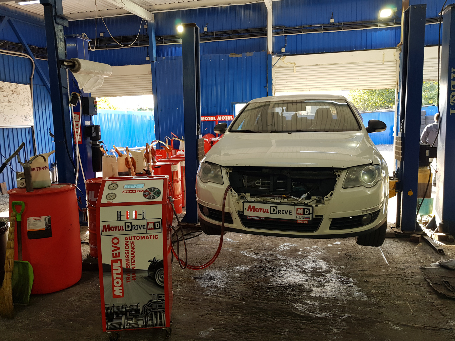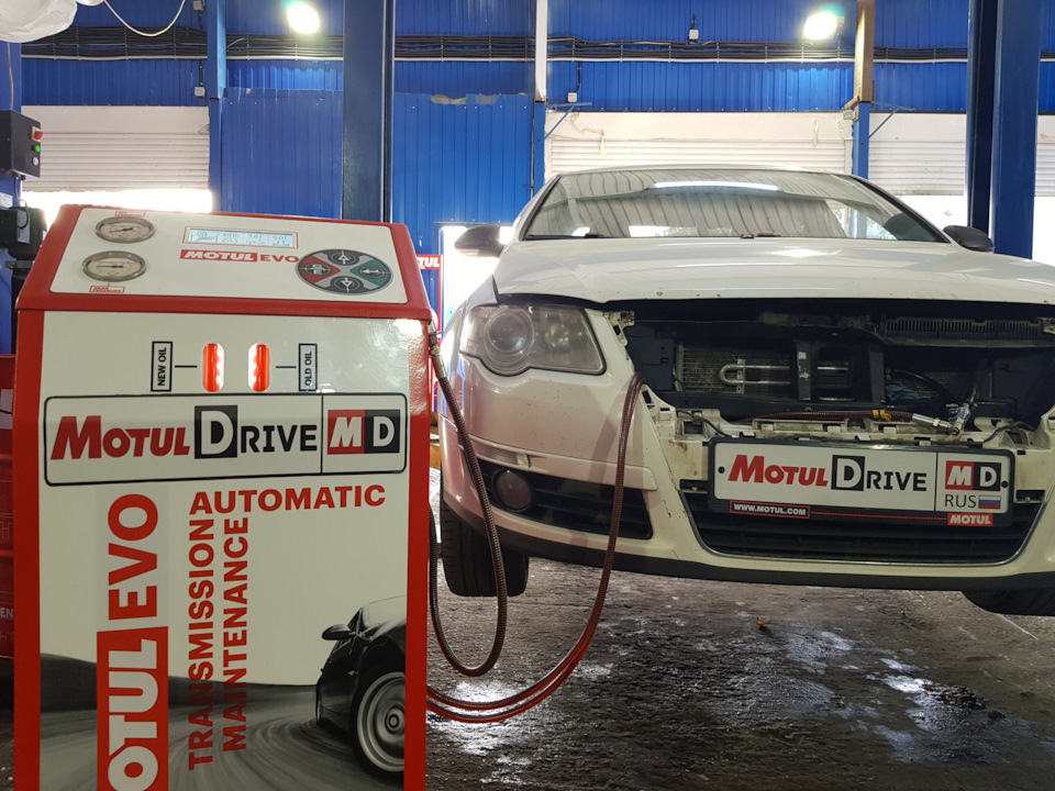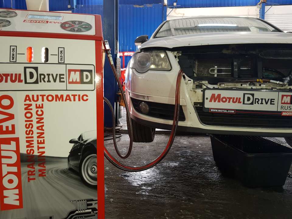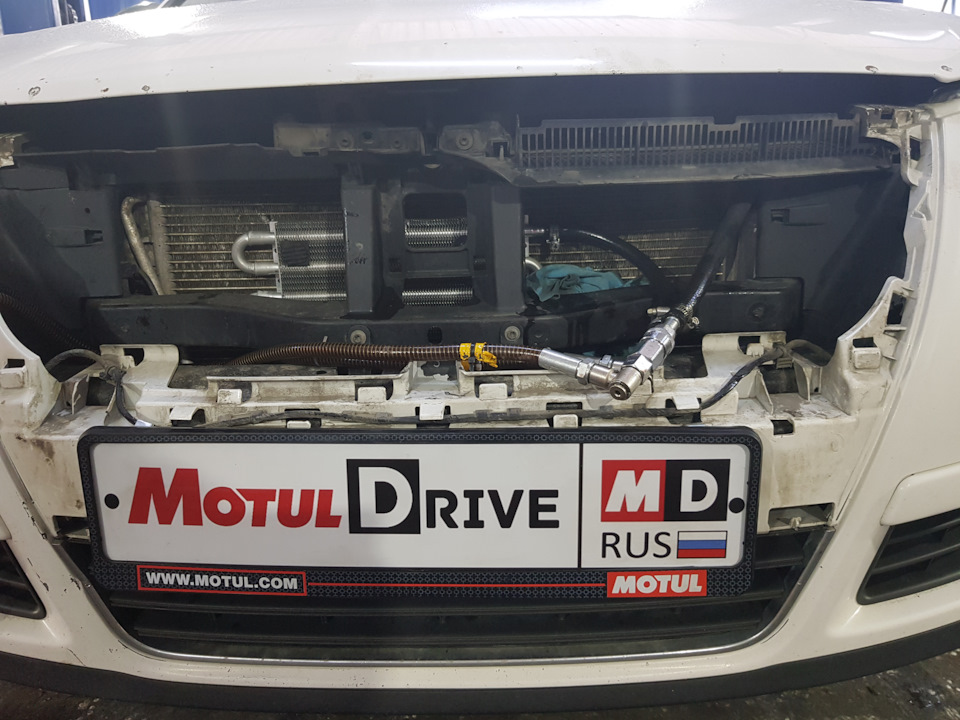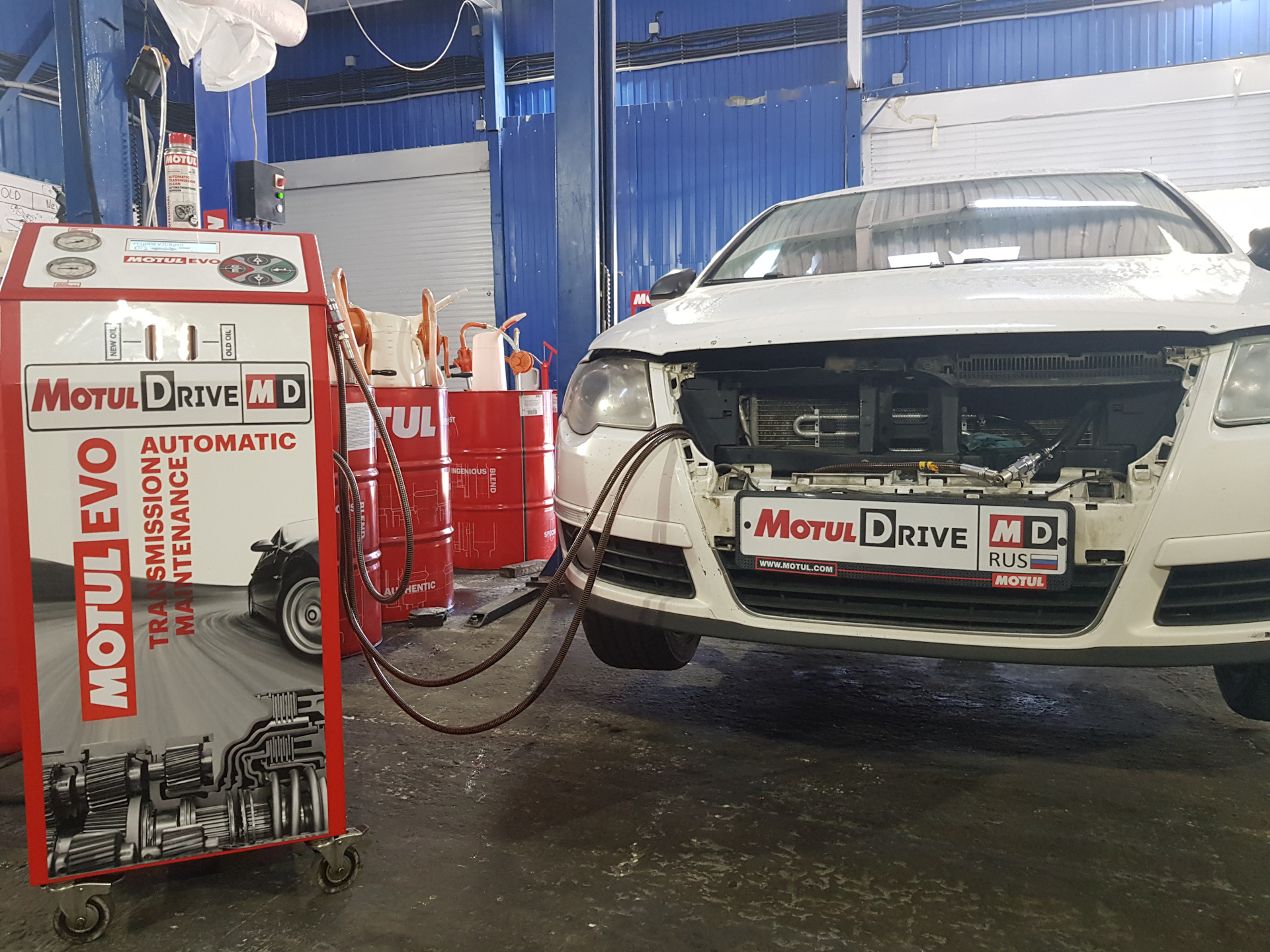 Подключаемся к контурам охлаждения, добавляем промывочную присадку (Очиститель автоматической трансмиссии (0,3л) Motul 108127), включаем режим промывки. Затем переключаем передачи с интервалом 10-15 секунд в режиме промывки на 10мин. Промываем каналы и клапаны.