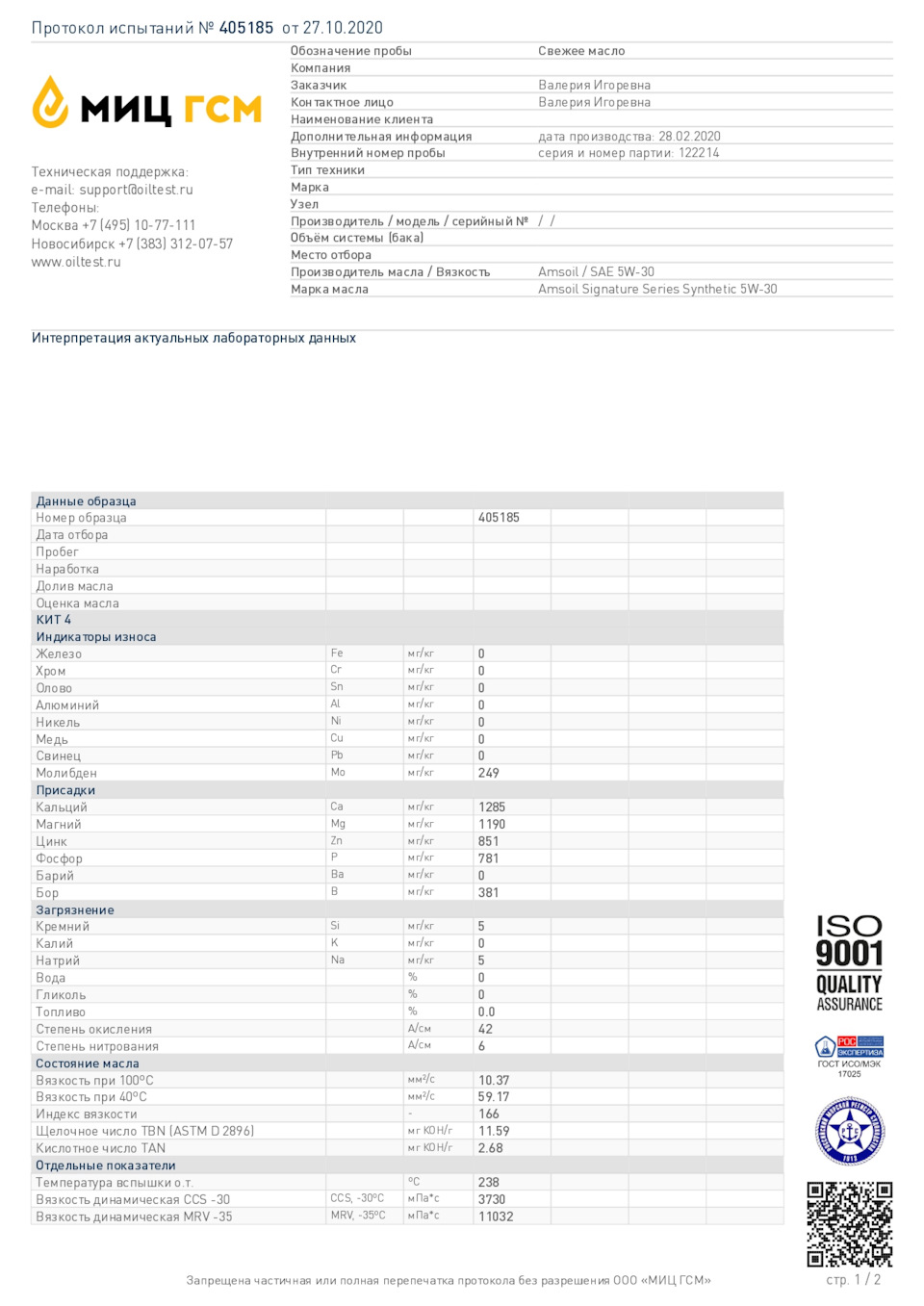 Первый ( всего будет четыре) расширенный анализ свежего моторного масла AMSOIL SIGNATURE SERIES SYNTHETIC MOTOR OIL 5W-30 в заводской упаковке на соответствие заявленным характеристикам и параметрам в лаборатории МИЦ ГСМ: