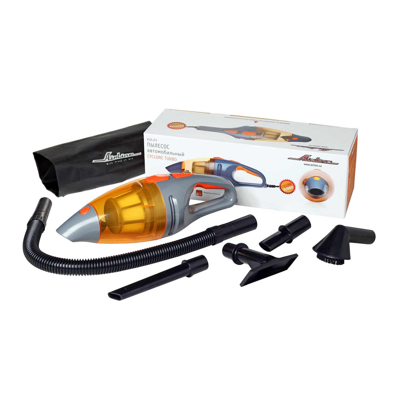 Пылесос CYCLONE TURBO с технологией CYCLONE и двойным HEPA-фильтром быстро собирает грязь и мельчайшую пыль. На конце пылесборника установлен съемный носик – через него можно вытряхивать мусор, не снимая весь пылесборник. Пылесос комплектуется удобной тканевой сумкой, питается от прикуривателя 12В.