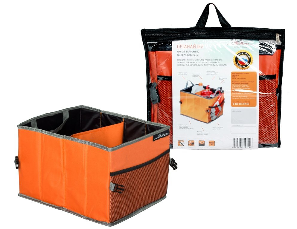 Органайзеры выполнены в ярком оранжевом и черном цвете. Они легко моются и не впитывают грязь, эффективно защищают обивку сидений и багажника от загрязнений. Пустой органайзер собирается гармошкой и в собранном состоянии занимает минимум места.