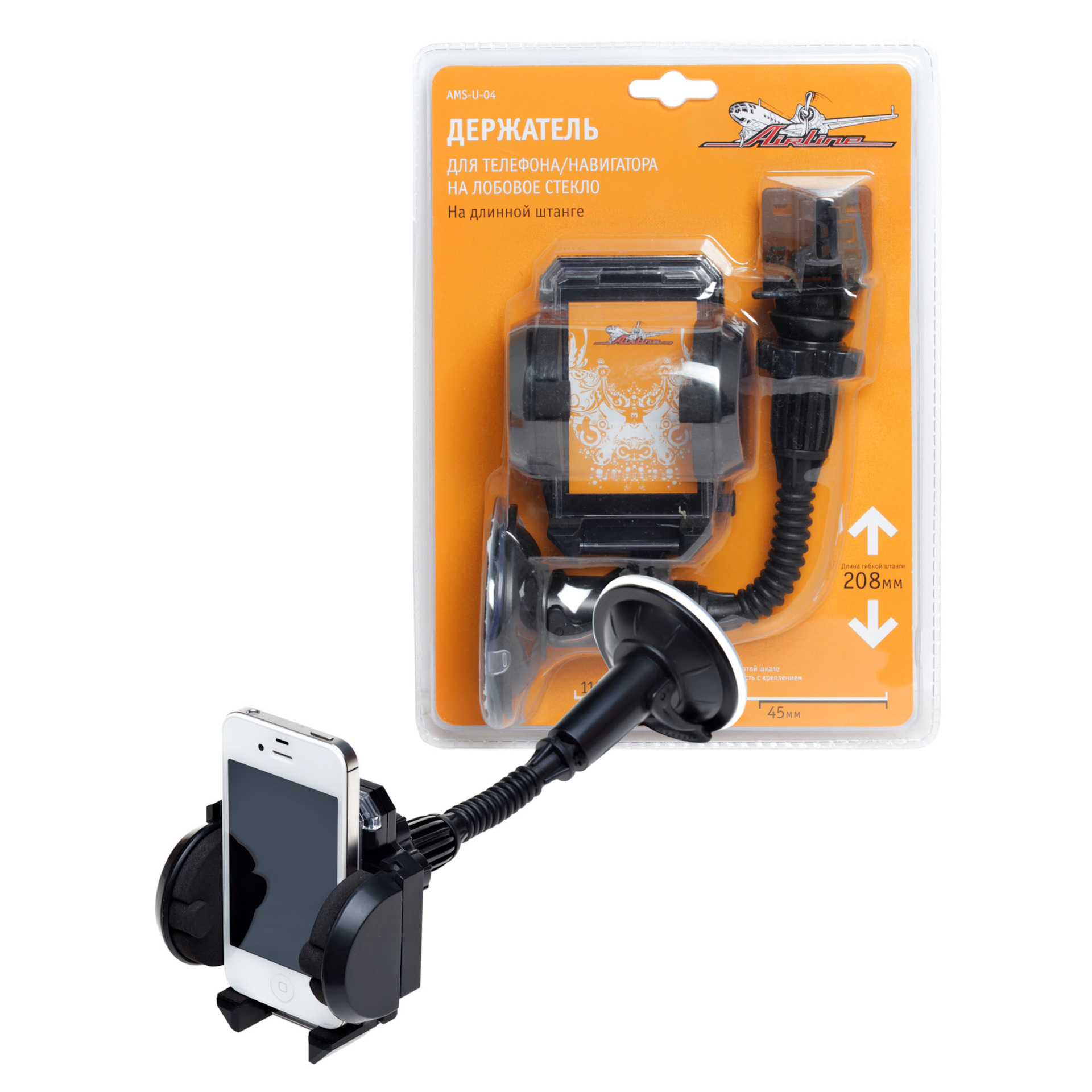 — Автомобильный держатель в прикуриватель с гибкой штангой, благодаря чему можно поворачивать телефон в любую сторону. Устанавливается в прикуриватель автомобиля, поэтому есть USB-разъем для зарядки.