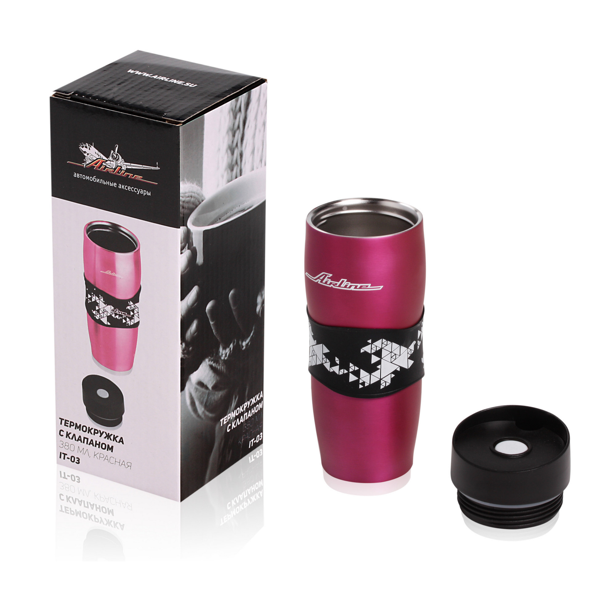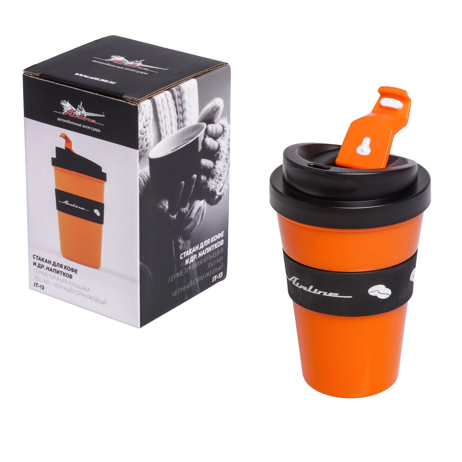 Изготовлен из пищевого пластика (PP) с пластиковой герметичной крышкой и термостойким резиновым держателем для защиты рук от ожога. Умещается в штатную подставку для стаканчиков в автомобиле.