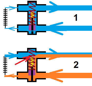 сиреневым — термоэлемент — деталь, переключающая поток масла.
