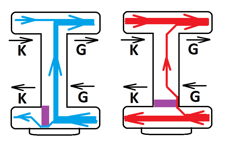 толщина линий показывает силу, интенсивность, скорость протока масла через соответствующие каналы.
