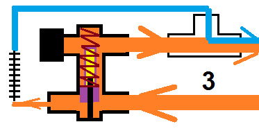 голубым цветом — поток масла холодный (температура масла ниже точки начала открытия термостата) — термостат закрыт.