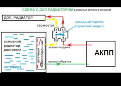 Основной радиатор будет теплонагружен, т.е АКПП будет подогревать ож. И наоборот, зимой согревшись, в случае если термостату конец придет, жидкость охладится в доп радиаторе. Я бы разветвление делал до основного радиатора.