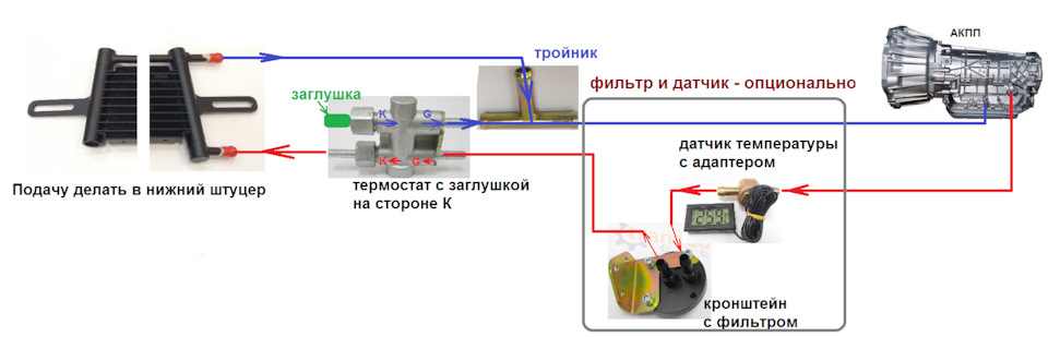 порт на стороне более холодного змеевика термостата должен быть заглушен, а обратная линия от масла/
