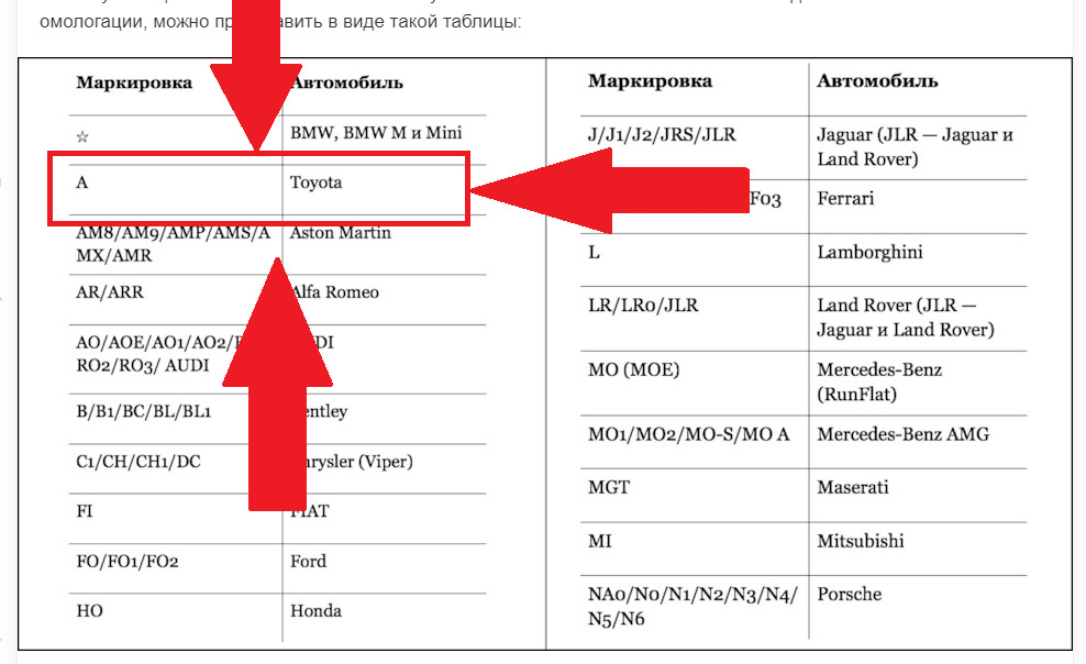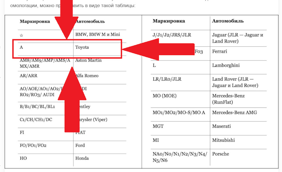 Узнать, имеет ли шина омологацию, можно по маркировке в ее описании или на боковине (символы сразу после названия). Метка омологации состоит из одной-двух букв и цифры. Большие ничего на шине не будет говорить о том, что она предназначена для конкретной марки или автомобиля, поэтому не ищите на этикетке или боковине упоминания Porsche или BMW. Список кодов омологации, можно представить в виде такой таблицы: