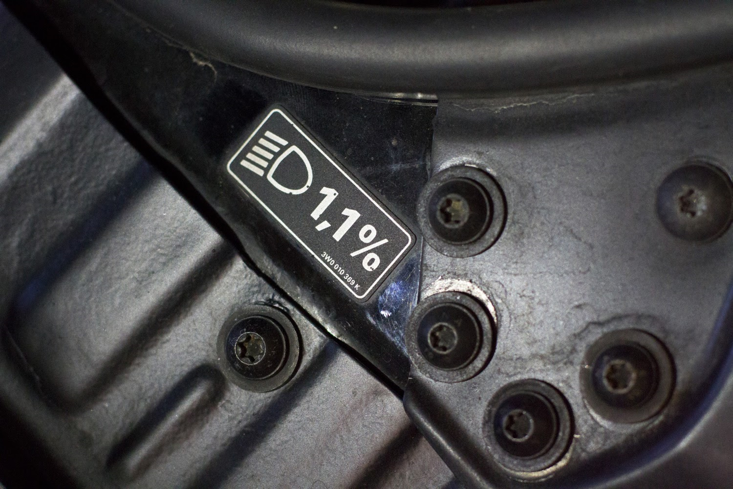 4. Открываем капот, вооружаемся фонариком и разыскиваем специальную табличку или наклейку, с пиктограммой ближнего света и цифрой в процентах. Нужная нам цифра может находится на фаре, внутренней стороне капота, на кузовных элементах подкапотного пространства. Не нашли с первого раза? Не отчаивайтесь. Поищите внимательней. Возможно, она указана на маске фары, выдавлена на её задней стороне или даже на одном из креплений блок-фары к кузову.