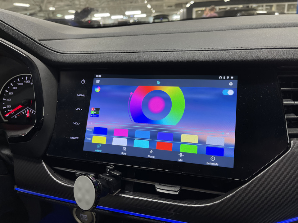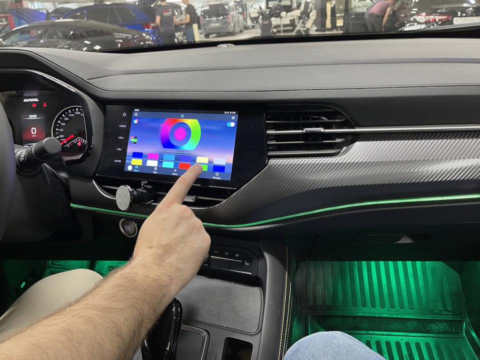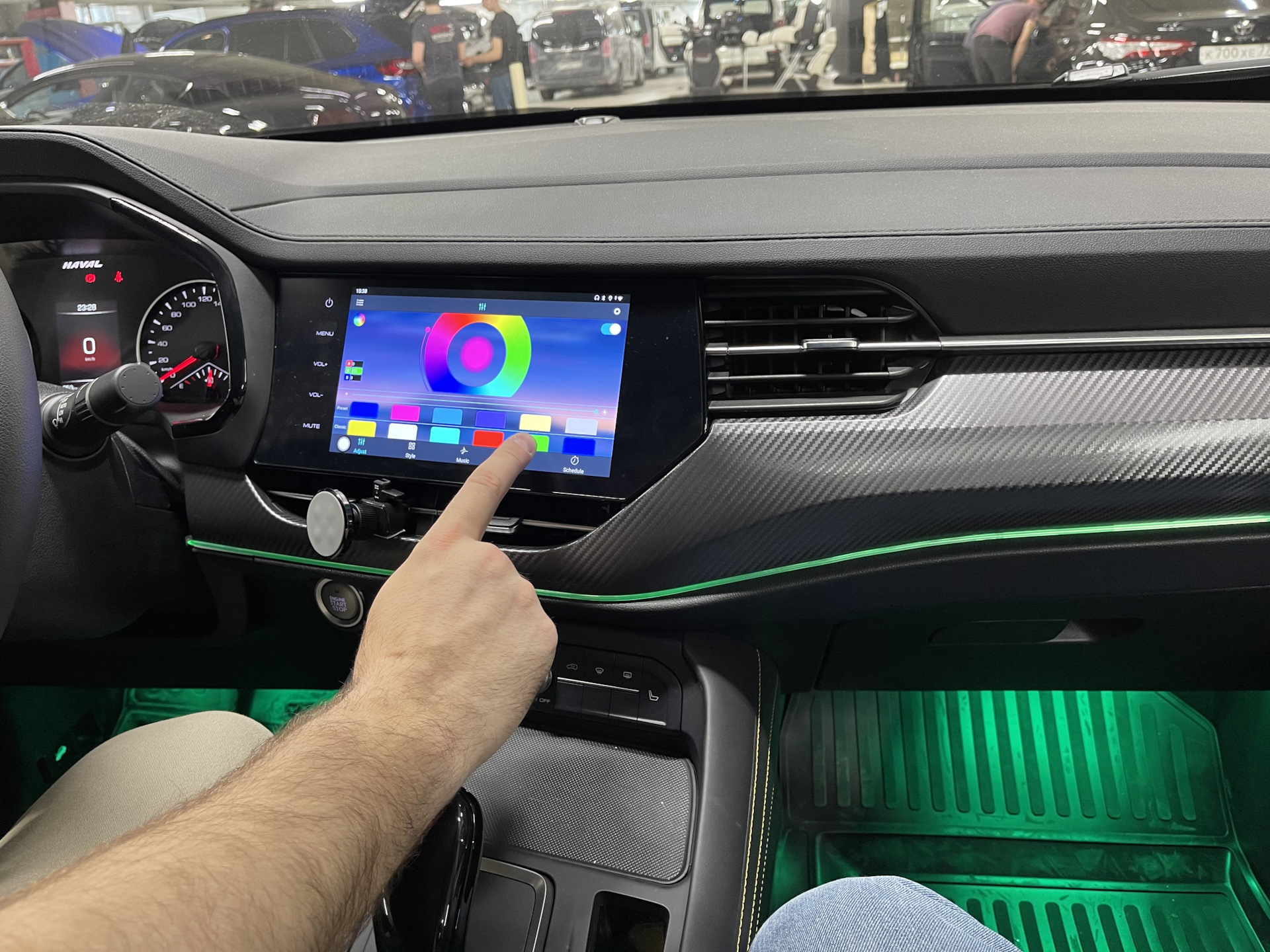 в этот же авто мы установили светодиодную подсветку и управлять этой подсветкой можно через смартфон или через штатное головное устройство, если сперва к нему подключить нашу доп систему, о которой мы писали выше.