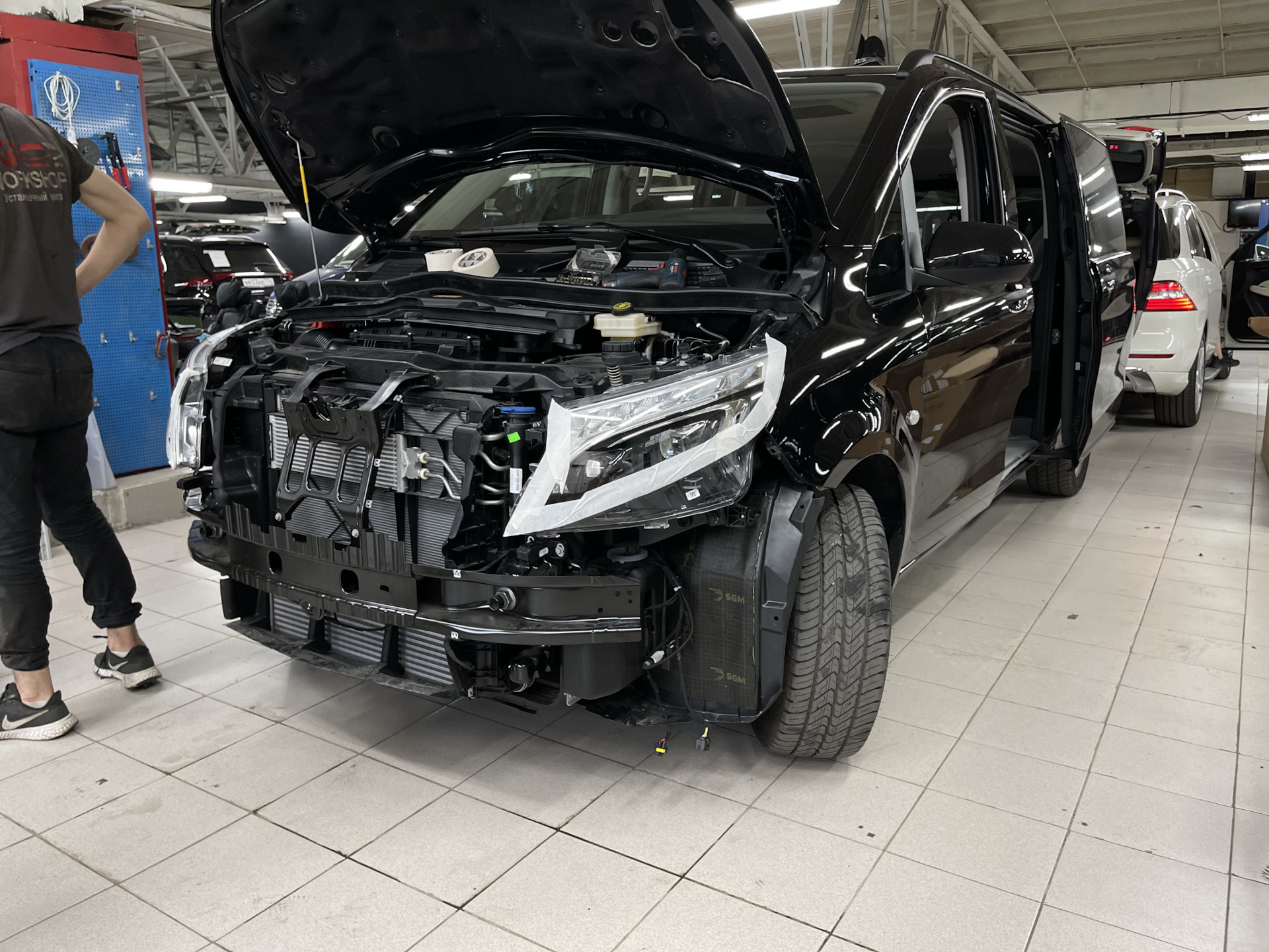 Сперва приложим новый передний бампер в стиле Майбах на фоне неизменённого ранее Мерседес V-Class W447 и пофантазируем как оно будет смотреться …