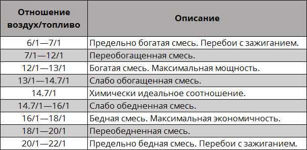 В идеальных условиях работы двигателя количество воздуха должно превосходить количество топлива в 14.7 раз. То есть на одну каплю топлива приходится 14.7 «капель» воздуха. Такое соотношение называют стехиометрическим и максимально полезным с точки зрения эффективности работы двигателя.