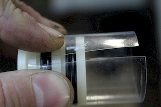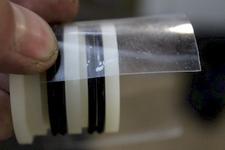 13. Основная проблема установки втулки – это перемещение резиновых колец через канавку в корпусе. Резиновые кольца цепляются и рвутся. Для легкой установки в комплект вкладывается прямоугольник ПЭТ пленки, из него надо вырезать полосу длиной примерно 5 см. Оборачиваем полосу поверх втулки без нахлеста.
