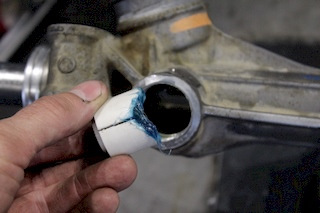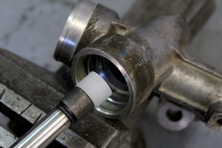 14. Посадочное гнездо смазываем. Сворачиваем трубочкой ленту, аккуратно вставляем в корпус на посадочное гнездо под втулку. Втулку смазываем снаружи. По такому настилу втулка легко заходит на место без повреждений. Далее придерживаем пальцем втулку, вытягиваем плоскогубцами полосу.