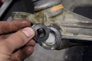 7. Вынимаем втулку с пассажирской стороны. Отгибаем усы при помощи трех игл и выталкиваем втулку наружу горизонтальным валом.