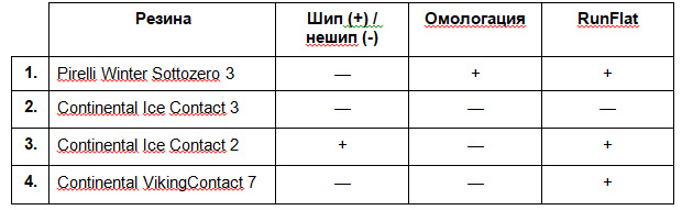 Все они немного отличаются между собой наличием омологации, технологии RunFlat и шипов.