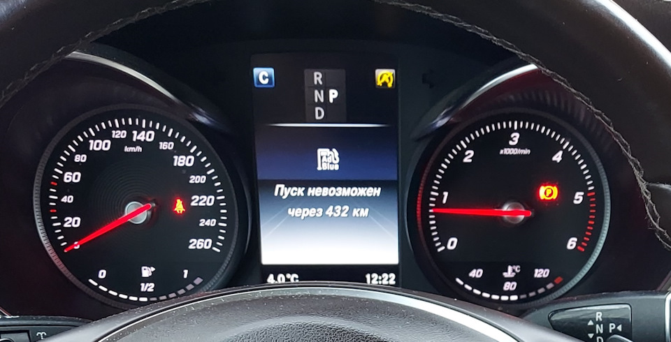 Владелица данного Мерседеса GLC250d 2017 года обратилась к нам после того, как у нее на приборной панели возникло предупреждение о невозможности пуска двигателя через 432 км